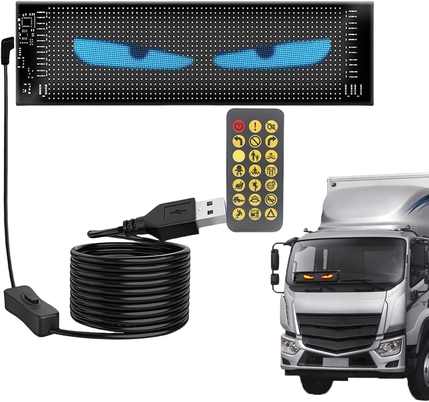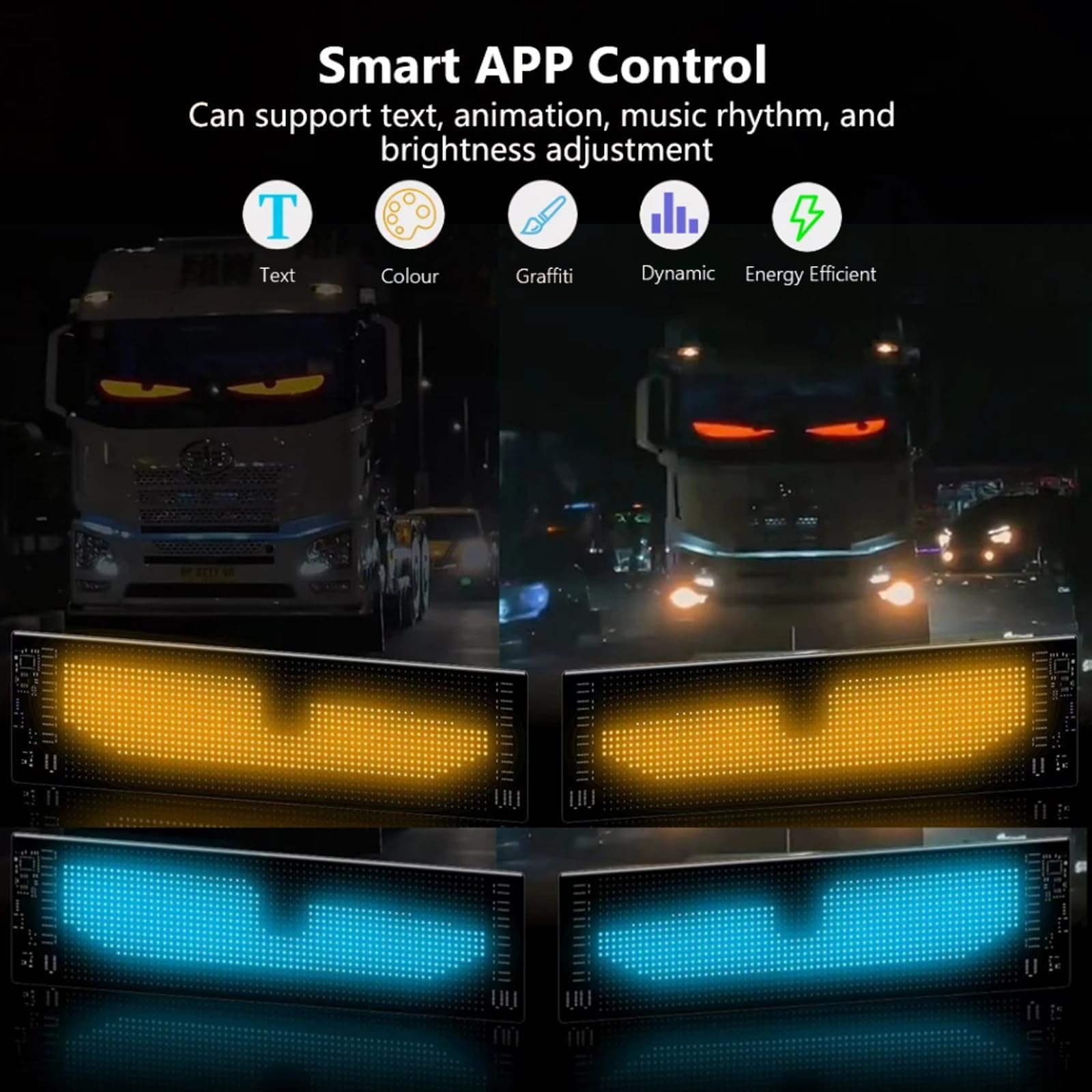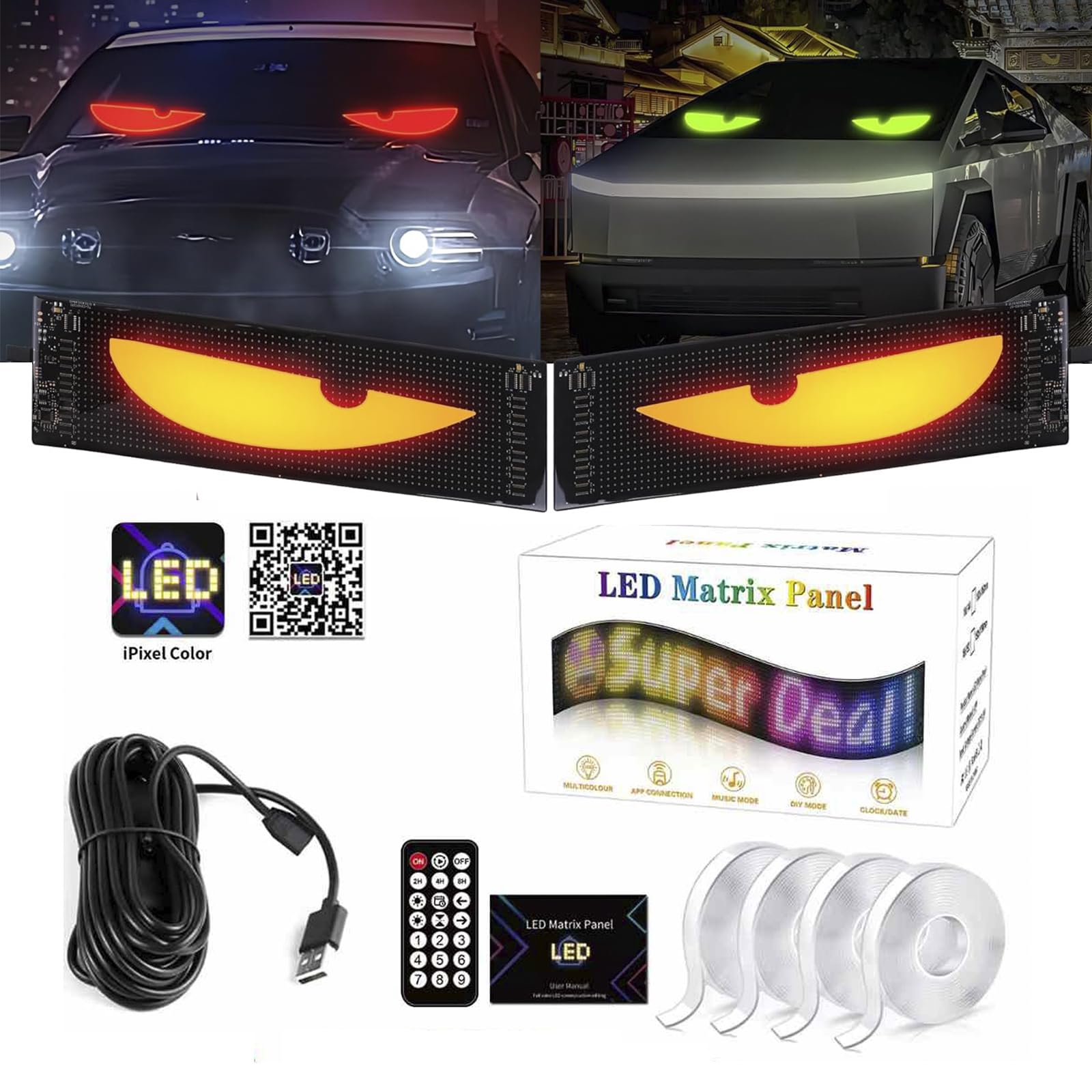 Contrôle Intelligent d'APP: avec la matrice de LED connectée d'APP, vous pouvez bricoler le texte, le motif, l'animation selon vos propres besoins et scènes, mais également ajuster la luminosité et la vitesse pour répondre parfaitement à vos besoins. Matériel: PU+FPCB Mode d'alimentation: Écran: USB plug - in, télécommande: bouton batterie (bien équipé) Puissance: 5V / 2A 10W Dimensions: T1:10., 2*34., 8cm、T2:12*59., 5cm Accessoires d'emballage: 1 * voiture démon Eye Light, 1 * télécommande, 1 * ruban adhésif double face, 1 * instructions Perles de Lumière RGB En Couleur: la matrice LED de haute qualité peut non seulement émettre une lumière de haute intensité, mais aussi une faible consommation d'énergie, l'effet de couleur sera plus lumineux et attrayant. Yeux Led Pour Voiture AOBUJDUB Yeux Du Diable Voiture, Lumière Yeux Du Diable Pour Voitures, Panneaux Yeux Voiture Led Visibilité améliorée] : L'écran LED flexible programmable pour voiture peut améliorer efficacement la visibilité et la beauté du véhicule. Il peut également définir des panneaux d'avertissement pour améliorer la visibilité du véhicule et rappeler efficacement aux autres véhicules de conduire Design DIY & Support Multilingue: Le panneau LED programmable permet de personnaliser textes, dessins et animations. La luminosité, fréquence de clignotement... Señal De Ojo LED Para Camión, Luz De Control Remoto Publicitaria Con Desplazamiento Pantalla Led Flexible Programable Diy Para Accesorios De Coche Y Camion