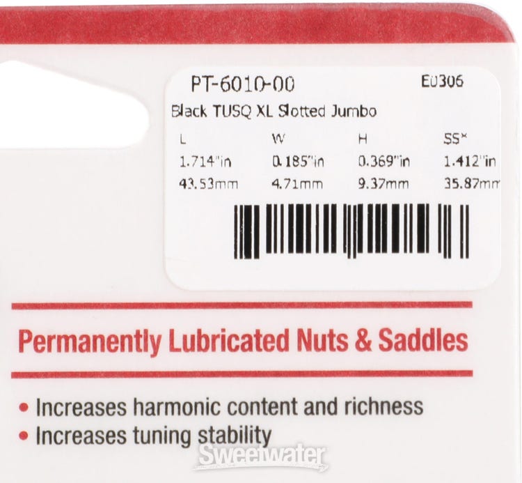 PQ-6010-00 - Instruments de musique Ivoire Synthétique Pour Guitare Graph Tech Tusq PQ-6010-00 Slotted Nut 36/44 Gibson LesPaul SG Graph Tech 6010 TUSQ est tout simplement plus efficace dans le transfert de vibrations vers le haut de votre guitare, ce qui donne des basses grandes et des cloches claires comme des aigus Cet écrou supérieur Tusq de Graph Tech pour Gibson de style Jumbo est fabriqué en plastique qui ressemble à l'ivoire. Il est pré-rainuré pour une installation rapide et facile., Dimensions : Longueur : 44,07 mm., Largeur : 4,98 mm., Hauteur : 9,3 mm., E à E - 36,2 mm. Le PQ-6010-00 est le choix parfait pour remplacer et mettre à jour l'écrou de votre guitare électrique Gibson. Il est pré-rainuré pour une installation rapide et facile GraphTech Tusq ~ Écrous de guitare faits à la main Ivoire Slotted 36 / 44 mm modèle droitier. 12 Radius. The PT-6000-00 is a great option to upgrade the nut on your Gibson USA guitar. It has a flat bottom and is pre-slotted for a quick and simple install. Pas encore arrivé...que faire?? Sillet qui convient parfaitement pour mon Epi de 1963. Très bon site de vente Les guitaristes et les guitaristes sont d'accord., ., ., les guitares prennent vie avec l'ivoire artificiel TUSQ. Ce matériau fabriqué par l'homme est fabriqué pour être exempt d'incohérences et d'impuretés que l'on peut trouver dans des matériaux naturels.