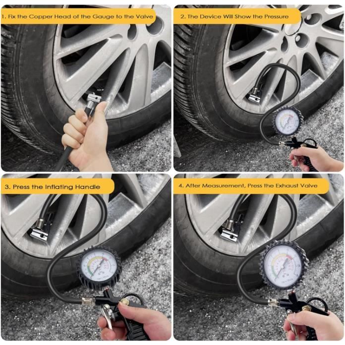 Pour assurer votre sécurité et optimiser les performances de votre véhicule, il est essentiel de vérifier régulièrement la pression de vos pneus. Avec un manomètre de pression pneu, vous pouvez facilement mesurer la pression de vos pneus et ajuster si nécessaire 【MATÉRIAUX DE HAUTE QUALITÉ】 La poignée est en alliage d'aluminium et est pulvérisée de plastique. Gonfleur De Pneus De Voiture Manometre Pression Pneu, Pistolet Gonfleur Pneus Voiture, Manomètre, Compresseur Accessories Avec Tuyau Et Poignee Gonflage 4 Unites De Mesure Aux Camions Voitures Velos Motos 88109773 Pistolet Haute Pression Le pistolet à air comprimé convient à la plupart des voitures, SUV, VR, camion, moto et vélo. (Pour une raison quelconque, le modèle à connecteur arrière ne s'adapte pas au tuyau d'air comprimé couramment utilisé, de sorte qu'il ne peut vérifier que la pression d'air des pneus, mais il présente un bon rapport qualité-prix si vous ne l'utilisez que pour vérifier la pression des pneus) 【SÉCURITÉ ET PROTECTION】 La pression normale des pneus est très importante pour les véhicules. Les accessoires fournis avec le gonfleur de pneus peuvent grandement faciliter son utilisation. Recherchez des modèles incluant des adaptateurs pour différentes valves, un tuyau flexible, et des embouts pour gonfler des ballons ou matelas Pistolet à air comprimé facile à utiliser, jauge de gonfleur de pneu 【Le package comprend】 1 x manometre pression pneu 1 x adaptateur d'angle droit 1 x adaptateur de valve 4 x bouchons de valve 【INSTRUMENT DE HAUTE QUALITÉ】 RUFT PRESSION PARTOL Plage de mesures: 0-16 bar et 0-220 PSI, longueur du tuyau: 360 mm, diamètre manomètre: 65 mm, l'unité de mesure de pression de pneu de mesure a du psi et de la barre. En plus de détecter la pression des pneus, vous pouvez également utiliser la bouche gonflable ci-dessous pour le gonflable et la déflation (10,7 mm de diamètre, vous avez besoin de pompes à air) Il a la fonction de souffler de la poussière pour les moteurs de véhicules.