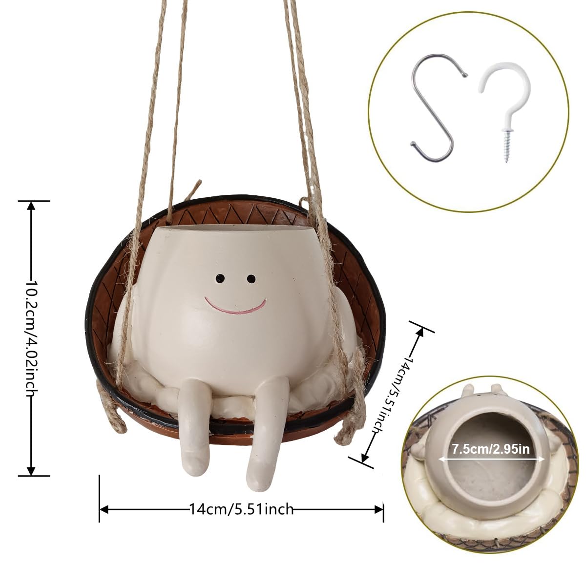 Décoration intérieure et extérieure : ce pot de fleurs convient pour les plantes grasses, les plantes de serpent, le philodendron, les chaînes de perles, les chaînes de cœurs, les plantes araignées, les fleurs d'imitation, etc. Chaise Hamac Balançoire - Hamac Chaise Suspendu - Siège de Balançoire Suspendu Extérieur Conception unique: Notre pot accrochant de planteur de chaise d'oscillation comporte un style fait sur commande et moderne qui ajoute une touche d'élégance à n'importe quel espace d'intérieur ou extérieur, se perfectionnent pour des utilisateurs recherchant un morceau de déclaration Joli cadeau idéal : ce pot de fleurs en forme de tête de balançoire est le cadeau idéal pour les enfants, les enfants peuvent habiller ces pots de fleurs et les mettre dans la chambre, comme si vous aviez un petit ami. Pot de fleurs suspendu unique : ils peuvent être utilisés à la fois à l'intérieur et à l'extérieur sans se fissurer ou se décolorer en raison du soleil ou de la pluie. Ce produit unique et créatif peut être utilisé à l'intérieur comme à l'extérieur et ajoute du charme à votre maison ou jardin Green Living : lorsque vous plantez vos plantes préférées (comme : une chaîne de perles vivant) dans notre pot de fleurs à tête hainging, le pot de fleurs ressemble à un enfant mignon. Pot de fleurs en résine : ce pot de fleurs suspendu est un objet décoratif captivant, avec son design distinctif en forme de visage et son expression souriante qui ajoute une touche de plaisir et de charme à votre chambre et jardin. Pot de fleurs sur une balançoire, pot de fleurs au visage heureux, jolie décoration d'intérieur, jardinière au visage heureux, cadeau pour amoureux des plantes, cadeau d'anniversaire, pot de fleurs Pflanztopf