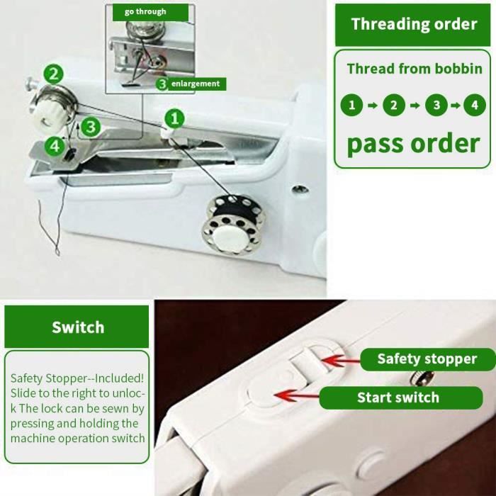 Elle est parfaite pour les déplacements, les voyages ou pour des réparations rapides à la maison. Machine à Coudre Portative, Mini Machine à Coudre Électrique pour Adulte, Facile à Utiliser pour les Débutants Point Rapide Adapté aux Vêtements Tissus Bricolage Cette machine à coudre électrique portable est livrée avec des accessoires pratiques qui simplifient la couture. Cette Mini Handnähmaschine Elektrisch offre une flexibilité maximale. 🎁【Polyvalente】Cette Mini Handnähmaschine Elektrisch permet de coudre une grande variété d'articles : vêtements, masques, oreillers ou loisirs créatifs. Dotée de 4 points de réglage du fil et d'une plaque frontale amovible, elle est idéale pour les débutants, les projets DIY pour enfants ou les réparations de couture professionnelles. Tragbare Elektrische Nähmaschine Les enfants peuvent créer des projets DIY en toute sécurité avec ce tissu d'entraînement., Remarque : 1., L'aiguille est pointue ! Mini Machine à Coudre Portable pour Travaux Manuels, Outil de 📦[Ensemble de 26 pièces] Comprend : 1 Mini Handnähmaschine Elektrisch, 12 bobines, 5 aiguilles, 2 boutons, 1 mètre ruban, 1 enfile-aiguille, 1 paire de ciseaux, 1 câble de chargement USB, 1 pince à épiler et 1 manuel d'instructions. Utilisez-la pour : Tragbare Elektrische Nähmaschine Réparer les trous dans les pantalons ou les jupes sans vous déshabiller. Informations produit Nom du produit : Machine à coudre électrique portable Matériau : ABS Style : Simple et moderne Dimensions : 20 x 10 x 5 cm Poids : 300 g Contenu de l’emballage : 1 Mini Handnähmaschine Elektrisch Conception Portable Parfaite]: Mini machine à coudre portable, légère et compacte, facile à transporter, design ergonomique. Vous pouvez facilement résoudre le problème de couture lorsque vous rencontrez le problème d'urgence d'une déconnexion soudaine ce qui est très pratique. La machine à coudre portable est une bonne aide pour la vie, convient à la maison, aux voyages, etc... Generic Machine à Coudre Portative Blanche, Mini Machine à Coudre électrique Portable Pour Adulte, Facile à Utiliser Et Point Rapide Adapté Aux Vêtements, Tissus, Bricolage à Domicile Et Voyage - Prix pas Verrouillez toujours la machine., 2., N'utilisez jamais la batterie et l'adaptateur simultanément., 3., Lisez le manuel ou regardez des vidéos YouTube avant utilisation., 4., En cas de problème, vérifiez la polarité de la batterie., 5., Convient uniquement aux matériaux d'une épaisseur ≤ 1,8 mm.