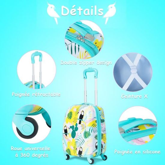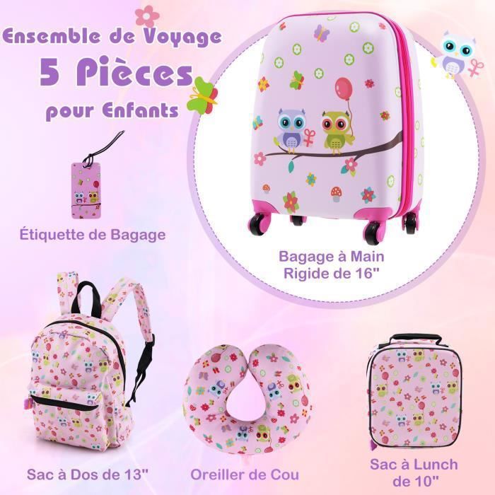 Sac A Dos Valise COSTWAY Valise Enfants à Roulettes 18" Avec Sac à Dos 12", Roues Coque Imperméable Poignée Rétractable, Licorne, 3 Ans+, Rose Clair Ensemble Bagage Enfant Avec Coussin Nuque Et étiquette Le sac à dos et la valise ont des poignées de transport, et le sac à dos dispose d'une bandoulière réglable pour faciliter le transport. La poignée du bagage à roulettes est réglable sur trois niveaux pour suivre la croissance des enfants. La valise est fabriquée en ABS et PC durables et... Découvrez la sélection Valise enfant pas cher de et sa large gamme de modèles. Qualité et Confort au meilleur prix. Retrait magasin et Livraison Contenu de la livraison : 1 valise pour enfant., 1 sac à dos., 1 boîte à déjeuner., 1 coussin de nuque., 1 étiquette de bagage. La valise du bagage pour enfant est fabriquée en matériau ABS et PC durable et imperméable qui résiste aux voyages. DREAMADE Valise Enfant 16et Sac à Dos 13avec Oreiller Cervical&Sac-Repas Isolé&Étiquette,Bagage à Main Enfants 5 Pièces avec 4 Roues à 360°,Ensemble Valise Roulette Garçon Filles (Fusée Bleu Marine Portable et facile à manœuvrer : la valise pour enfant dispose de 4 roulettes universelles et d'une poignée télescopique réglable qui permet de naviguer confortablement dans les endroits occupés. La poignée du bagage à roulettes est réglable sur trois niveaux pour suivre la croissance des enfants. Le matériau ABS et PC imperméable et résistant aux rayures assure la durabilité de la valise 4 roues universelles silencieuses permettent le mouvement libre de la valise Le coussin de nuque confortable réduit la charge sur le cou lors des voyages et une utilisation quotidienne La boîte à repas avec carte de nom est équipée d'un film PEVA étanche. Taille de l'étiquette de bagage : 11 cm x 5,5 cm (L x l) Poids net : 2,5 kg. Caractéristiques techniques : Couleur : rose/bleu/noir Matériau de la valise : ABS, PC, métal, aluminium Matériau du sac à dos : polyester Matériau de la boîte à lunch : polyester, PEVA Matériau du coussin de nuque : velours, éponge Taille de la valise : 30 cm x 23 cm x 53-82 cm (L x l x H) Taille du sac à dos : 25 cm x 13 cm x 33 cm (L x l x H) Dimensions du sac à déjeuner (L x l x H) : 25 x 22 x 7 cm. Espace de rangement spacieux et structuré : le chariot pour enfants comprend une valise de voyage de 16 pouces et un sac à dos de 13 pouces, offrant suffisamment d'espace ainsi que divers compartiments pour un emballage organisé et favorise l'autonomie et la sécurité Ensemble de bagages pour enfants tout compris : l'ensemble de 5 valises pour enfants comprend un coussin de nuque en velours doux, une boîte à déjeuner isolée imperméable et une étiquette à bagage pour une identification rapide. Spécifications: La valise de 40,6 cm et le sac à dos de 13 pouces offrent beaucoup d'espace pour un rangement organisé Il répond aux exigences de taille des bagages à main des compagnies aériennes La poignée en aluminium réglable sur trois niveaux peut être ajustée à la taille des enfants.
