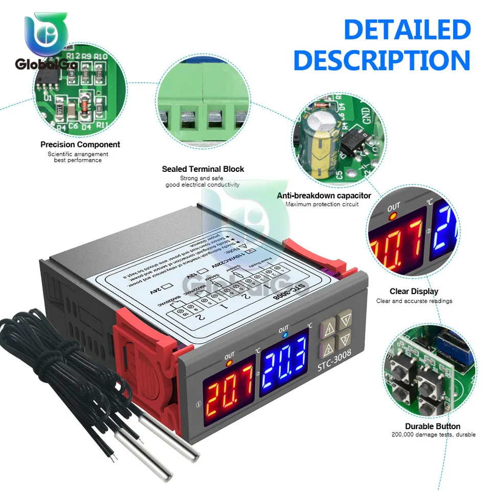 Merci de votre compréhension., 2., Les moniteurs ne sont pas calibrés de la même manière, la couleur de l'élément affichée sur les photos peut être légèrement différente de celle de l'objet réel. Spécification: Condition: Tout neuf Type d'élément: Thermostat numérique Modèle de produit: STC-3008 Plage de contrôle de la température: -55 ° C ~ +110 ° C Affichage à l'écran: double écran double affichage Précision de mesure de la température: ± 1 ° C (-50 ° C-70 ° C) Alimentation optionnelle: DC12V, DC24V, 110-220VAC, (50 / 60Hz) Taille de la machine: env., 75 * 34., 5 * 85mm / 3 * 1., 4 * 3., 3in Capteur: capteur NTC (1 mètre) Ouverture d'installation: env., 71 * 29mm / 2., 8 * 1., 1in Matériau du boîtier: Coque en plastique ABS ignifuge Capacité de sortie: 10A Liste des packages: 1 * contrôleur de température 2 * sonde Remarque: 1., S'il vous plaît permettre une légère erreur due à la mesure manuelle. Les sondes Dual NTC sont plus sensibles et précises, la précision de la mesure de la température est de ± 1 ° C (-50 ° C à 70 ° C). Regulateur de temperature Numerique avec 2 sonde 220V STC-3008, Contrôleur Utilisé pour la régulation de la température, la ferme, divers réfrigérateurs, serres, aquariums, etc. EN STOCK : STC 3008 Contrôleur de thermostat de température AC 110V 220V, contrôleur de température numérique avec double affichage et double de sonde NTC, NT-FR-002539 pas cher. Livraison rapide partout en France Thermostat Frigo STC-3008 Contrôleur De Thermostat De Température AC 110V-220V Sonde Ntc 10k Régulateur à double température]Le régulateur de température numérique STC 3008 peut contrôler les deux appareils simultanément, avec des capteurs indépendants et des sorties. Alimentation: AC 110V ~ 220V. Capacité de contact du relais de sortie: Max. 10A.[Fonction chauffage et refroidissement] Les modes de refroidissement et de chauffage peuvent être automatiquement...