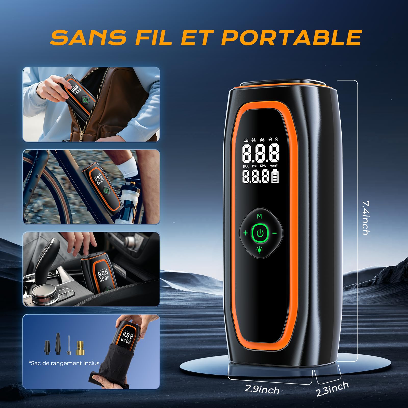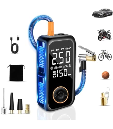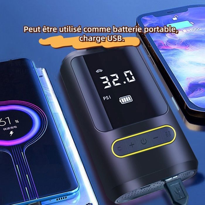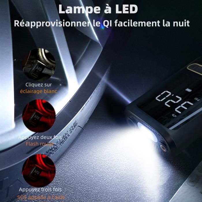 Un pouvoir durable]Avec sa batterie 10000mAh (3h d'utilisation continue, recharge en 2-4h), ce gonfleur pneu voiture fonctionne sans fil ou sur allume-cigare. Il peut gonfler 10 pneus de voiture ou 30 pneus de vélo de course, dites adieu à l'angoisse du pouvoir une fois pour toutes 【Écran LCD précis et arrêt automatique】Le grand écran LCD affiche les valeurs préréglées et les valeurs de pression en temps réel, ce qui facilite l'observation et l'utilisation à tout moment. Gonfleur Auto Moto Vélo Gonfleur Pneus Voiture Sans Fil, 220PSI Compresseur à Air Compresseur Air Sans Fil Pompe à Air Électrique, Compresseur à Air Portatif Gonfleur Pneus sans Fil Il est doté d'une lumière LED sur le dessus qui peut être utilisée pour gonfler dans l'obscurité, changer les pneus ou avertir d'autres véhicules la nuit. La partie supérieure comprend également un port de charge de type C et un port de sortie USB 5V/2A, ce qui lui permet de servir de source d'alimentation d'urgence pour les appareils électroniques. Compresseur À Air Portatif Gonfleur Pneus Voiture Pompe Électrique... Compresseur à Air Portatif Gonfleur Pneus Voiture sans Fil Electrique 【4+N MODES INTELLIGENTS】Le compresseur à air portatif est préréglé avec 4 unités de pression : PSI, KPA, BAR, KG/CM², et 4 modes de gonflage prédéfinis : vélo, moto, voiture et ballon. En même temps, pompe a velo electrique pour pneus peut être préréglé pour surveiller la pression des pneus et s'arrêter automatiquement lorsqu'elle atteint la valeur définie, afin d'éviter toute surcharge. Avec une précision de ±1%, c'est le compagnon idéal pour vos trajets.
