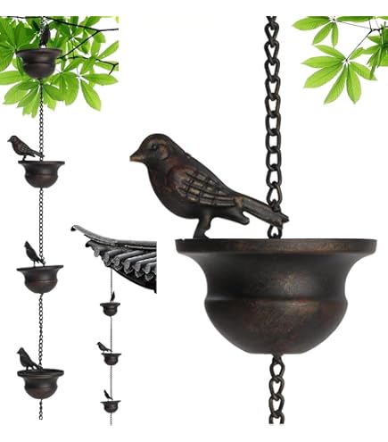 Tout en servant de tuyau de descente de rechange pour les gouttières, ils peuvent également être accrochés comme décoration d'intérieur dans votre jardin ou votre terrasse Design unique : les chaînes de gouttière, avec leur motif délicat montrant des oiseaux debout sur l'attrape-pluie, créent une atmosphère vibrante et naturelle. Robuste et durable : fabriquées à partir de métal et revêtues d'une finition en poudre noire, les chaînes de pluie pour gouttières en cas de forte pluie offrent une durabilité et une stabilité à long terme Chaîne De Pluie Lotus Pour Gouttières Extérieures Avec Adaptateur Chaine De Pluie Pour Remplacer Le Tuyau De Descente Detourner Leau Et Laffichage Domestique 12 Tasses Reglable Revetement En Facile à installer : l'installation est terminée en accrochant et en fixant les crochets de cet adaptateur de gouttière à l'avant-toit Nombreuses utilisations : la chaîne de pluie en métal, servant de carillon de pluie pour l'extérieur, produit un son mélodieux agréable les jours de pluie et apporte un sentiment de détente Carillon Pluie Extérieur Prime Garden Chaînes De Pluie Pour Gouttières Avec Adaptateur De Gouttière, Chaîne De Gouttière En Aluminium Martelé, Longueur De 2,4 M, Noir Décoration Extérieure Oiseaux ZERONE Chaîne de Pluie Oiseaux Mobiles Métallique Décoratif pour...