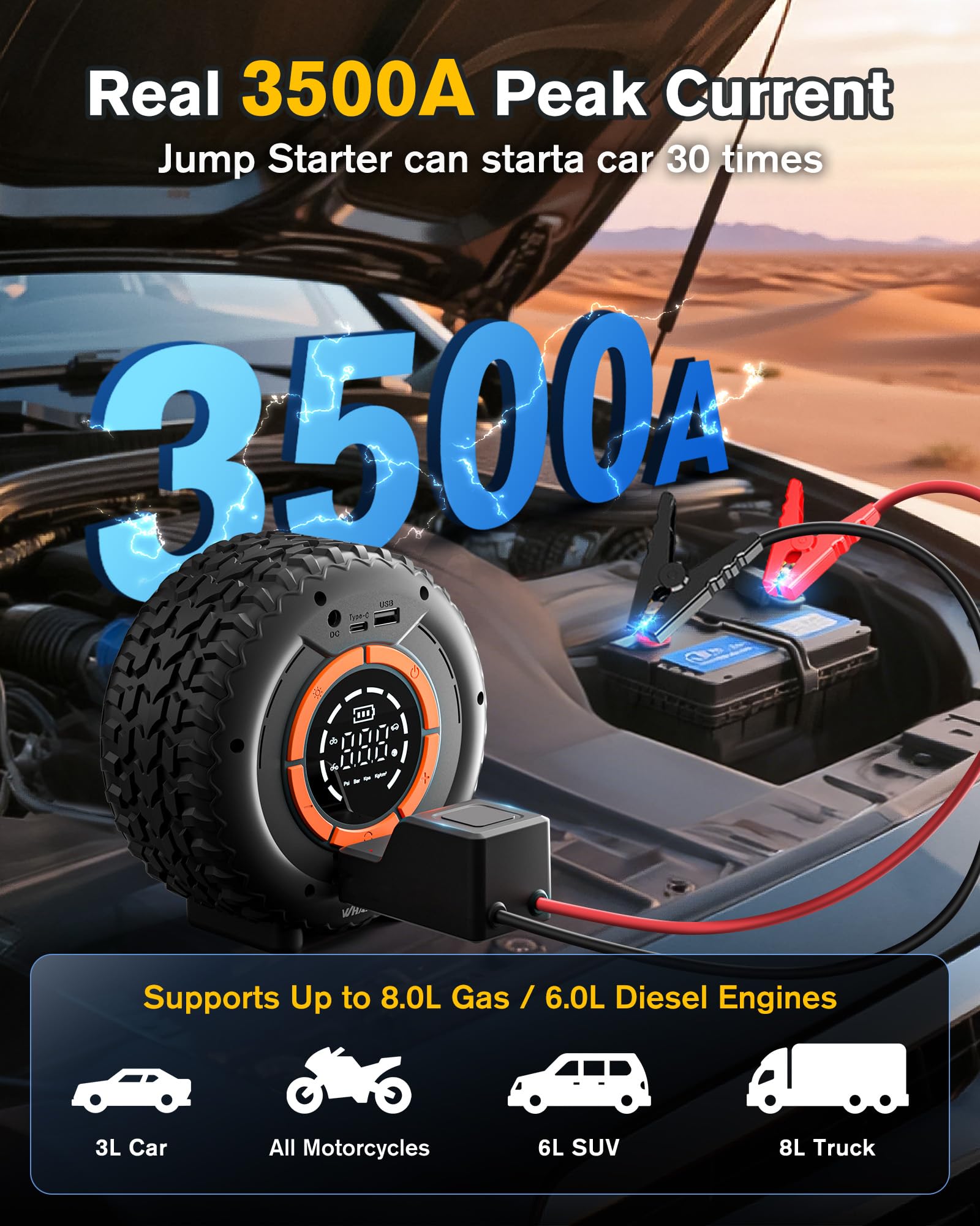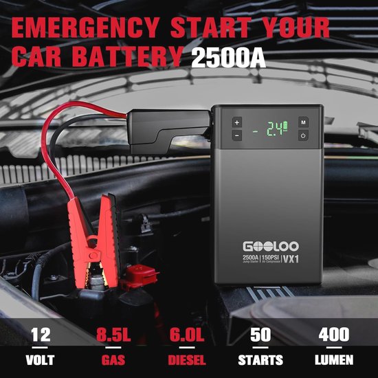 Alimentation en déplacement : utilisez l'appareil comme banque d'alimentation 12 V pour voiture et extérieur. Compresseur intégré de 150 PSI : le puissant compresseur d'air de 150 PSI gonfle les pneus de la voiture en quelques minutes. Lumière LED d'urgence multifonctionnelle : la lumière LED dispose de 3 modes : fixe, SOS, stroboscopique, idéal pour les urgences, la conduite de nuit, etc. Le boîtier robuste en PC/ABS offre une résistance aux chocs Plus besoin de vis manuelles. Black DéMarreur Batterie Voiture avec Compresseur d'air, 150PSI 1500A La solution d'urgence parfaite pour les voyages La sécurité avant tout : les fonctions de sécurité intégrées protègent contre la surchauffe, les courts-circuits, les surtensions, les surcharges et l'inversion de polarité. Avec un courant de crête de 3500 A, il peut démarrer des moteurs à essence jusqu'à 6,0 l et des moteurs diesel jusqu'à 4,0 l – Votre booster de batterie de voiture indispensable pour les voyages en voiture au Royaume-Uni et les matins glaciaux Batterie De Secours Voiture Booster De Batterie Puissant ACEZUK Booster Batterie 6000A Avec Compresseur - Démarreur De Voiture 12V, Gonfleur Pneus 150PSI, LED LED 600 Lumens Booster Voiture Compresseur Écran LCD pour un contrôle complet : l'écran LCD numérique affiche la pression précise des pneus, l'état de la batterie et le mode de fonctionnement. Prend en charge plusieurs unités de pression (PSI, Bar, KPa, Kg/cm²) - Polyvalent comme pompe à pneus pour voiture, moto, vélo et ballon DÉMARRAGE PUISSANT 3500A : La Powerbank de démarrage WHATOOK fournit un courant de pointe 3500 A, capable de démarrer les moteurs Essence jusqu’à 9,0 L et Diesel jusqu’à 8,0 L. Parfait pour les journées froides, pannes de batterie ou trajets longs-votre booster auto 12 V indispensable Tuyaux de pression améliorés avec double raccord : grâce à la fermeture à pression des deux côtés, le tuyau d'air se connecte plus fort et plus rapidement, sans filetage, sans perte d'air. La solution parfaite pour le camping ou les voyages en voiture Power Bank 3500A : cette banque d'alimentation portable fournit 3500 A de courant maximum, convient aux véhicules 12 V, aux moteurs à essence jusqu'à 9,0 L et aux moteurs diesel jusqu'à 8,0 l, le renfort idéal pour l'assistance routière lors des froides nuits d'hiver ou en voyage Design attrayant des pneus : un accroche-regard.