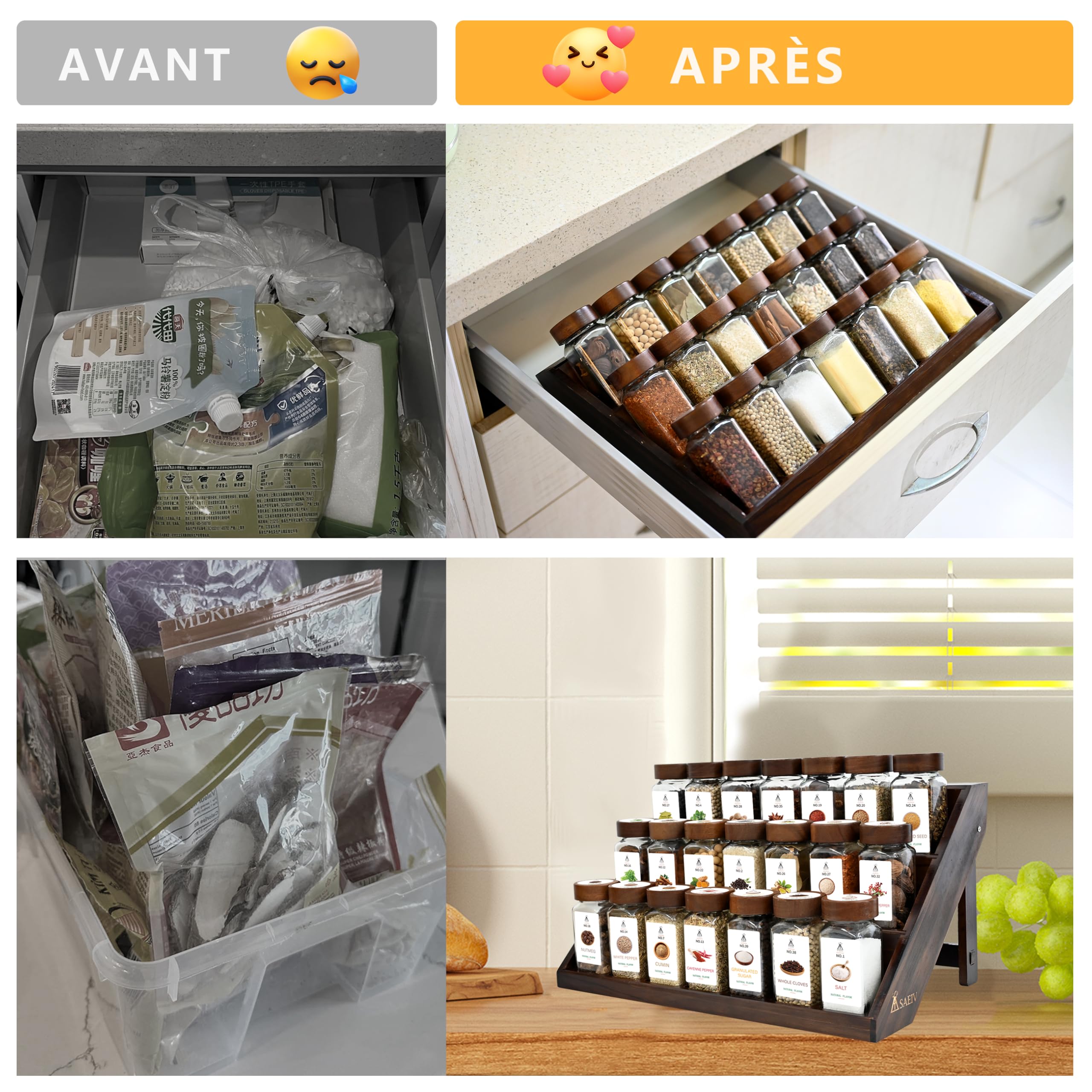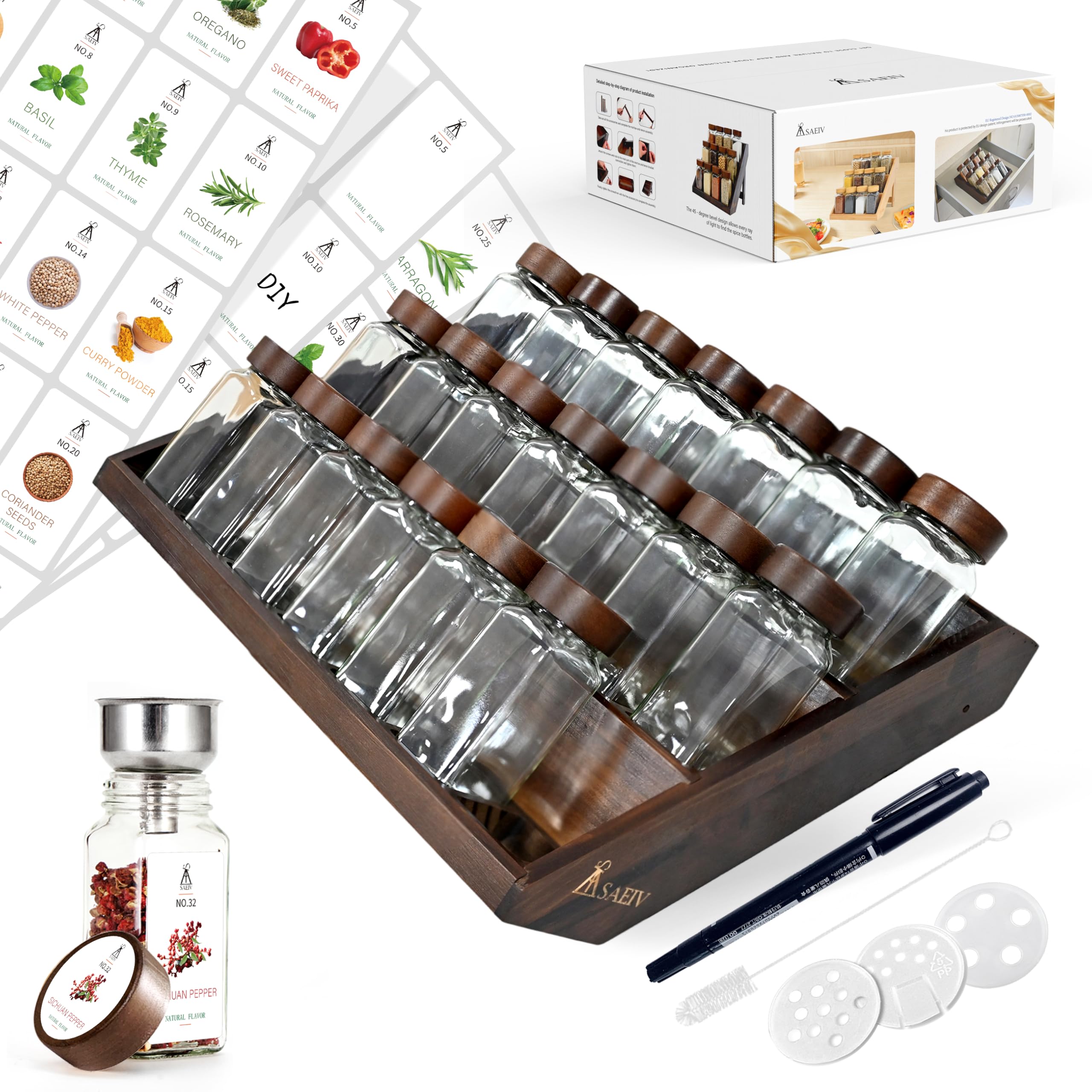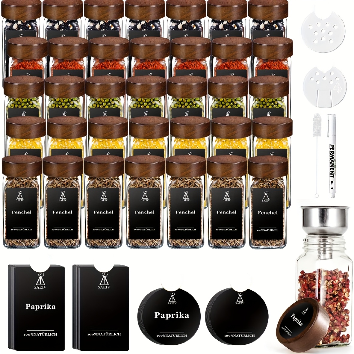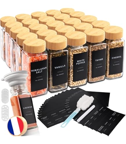 Les bocaux à épices passent au lave-vaisselle (à l'exception des couvercles) et sont donc particulièrement hygiéniques et faciles à nettoyer pour un usage quotidien. SAEIV Lot de 35 pots à épices carrés avec couvercle en bambou Ensemble complet de 24 pièces pour la cuisine Cet ensemble comprend 24 pots à épices en verre robuste de haute qualité, d'une contenance de 120 ml chacun. Idéal pour conserver et organiser les épices, les herbes, le sel, le poivre et autres ingrédients secs Permet de gagner de la place dans les placards ou sur les plans de travail., 1., Ensemble complet de 24 pièces pour la cuisine Cet ensemble comprend 24 pots à épices en verre robuste de haute qualité, d'une contenance de 120 ml chacun. Idéal pour conserver et organiser les épices, les herbes, le sel, le poivre et autres ingrédients secs. Cet ensemble comprend 24 pots à épices en verre robuste de haute qualité, d'une contenance de 120 ml chacun. Idéal pour conserver et organiser les épices, les... Le saupoudreur intégré et réglable permet un dosage contrôlé et propre directement à partir du pot., 3., Matériau transparent de haute qualité Fabriqué en verre solide, adapté au contact alimentaire, sans goût et qui n'absorbe pas les odeurs. Cet ensemble comprend 24 pots à épices en verre robuste de haute qualité, d'une contenance de 120 ml chacun. Rangement Set De 24 Bocaux à épices 120 Ml, Couvercles Hermétiques à V Epices Cuisine