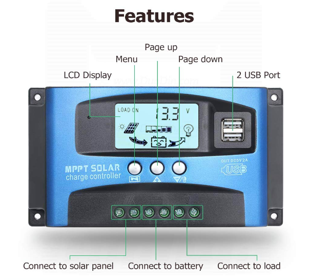 【HAUTE QUALITÉ】Regulateur panneau solaire prend en charge l'identification automatique de la tension 12/24/36/48V, les batteries au plomb et au lithium peuvent être utilisées, la tension d'entrée maximale du réseau photovoltaïque est jusqu'à 180V, la batterie 40A/60A peut être sélectionnée. 【TECHNOLOGIE MPPT】Controleur de charge solaire, utilisant la meilleure technologie de suivi MPPT, l'efficacité peut atteindre jusqu'à 99%. Contrôleur de charge solaire MPPT série eSmart 3 (12V/24V/36V/48V,20A-60A Le contrôleur de charge ECO-WORTHY 60A MPPT est le type de contrôleur de charge le plus efficace. Avec jusqu'à 99% d'efficacité de suivi, assure une charge solaire maximale qui fournit plus d'énergie à votre banque de batteries 【AFFICHAGE LCD】Régulateur solaire mppt avec un grand écran LCD, il peut afficher de manière dynamique et précise les données de fonctionnement et l'état de fonctionnement de l'équipement. Regulateur Panneau Solaire Ailao 60A Controleur De Charge Solaire 【TYPE DE BATTERIE APPLICABLE】Le programme de charge est facultatif, adapté à différents types de batteries, y compris les batteries au gel, les batteries scellées, les batteries ouvertes, les batteries au lithium ternaire, les batteries au lithium fer phosphate, etc. 【DISSIPATION RAPIDE DE LA CHALEUR】Le contrôleur adopte une conception de dissipateur thermique en alliage d'aluminium, un système de refroidissement à double ventilateur intégré, améliorant considérablement les performances de dissipation thermique; mécanisme de protection contre la surchauffe intégré, empêche efficacement le contrôleur d'être endommagé. Régulateur 12V 24V Automatique Mppt Régulateur De Charge Solaire MPPT 60 A, 12 V, 24 V, 36 V, 48 Regulateur Panneau Solaire Victron Mppt 75/15 Bluetooth La technologie d'alimentation numérique avancée augmente l'efficacité de conversion d'énergie du circuit à 98 %. La technologie avancée d'alimentation numérique augmente l'efficacité de conversion d'énergie du circuit à 98%. Le programme de charge est facultatif et convient à divers types de batteries, y compris les batteries gel, les batteries scellées, les batteries ouvertes, les batteries au lithium ternaire, les batteries au lithium au phosphate de fer, etc.