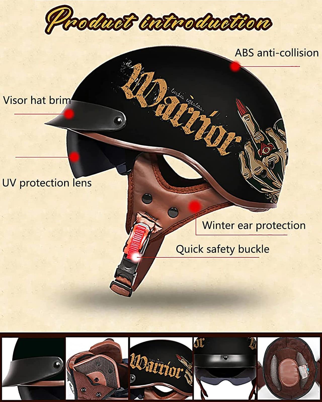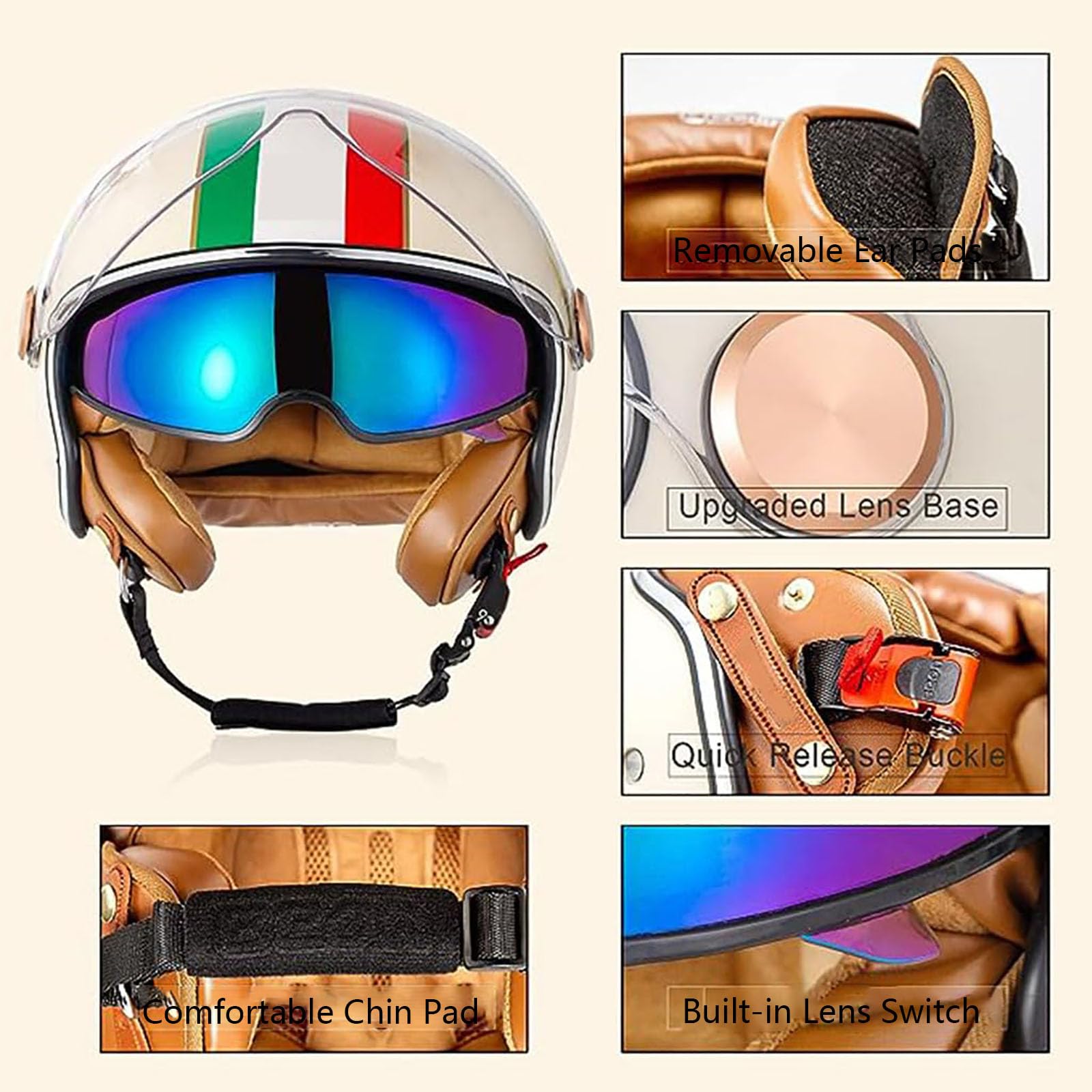 Design vintage : casque de moto 3/4 en cuir à visage ouvert, a naturellement une sensation vintage comme un casque de pilote des années 1950, offre une excellente ventilation et un large champ de vision et s'adapte bien à vos motos de route élégantes, adapté aux cruisers et aux randonnées, scooters et cyclomoteurs La couche de mousse de rembourrage EPS haute densité du casque absorbe fortement les chocs et absorbe donc les chocs plus efficacement. Casque 3/4 Ouvert Bluetooth 5.0 Homologué ECE DOT Retro Vintage 3/4 Face Ouverte Casque Moto Bluetooth , ECE Casque Jet 3/4 Ouvert ECE Nom : demi-casque, casque ouvert 3/4 vintage Casque Bluetooth de moto : 1., Utilise la dernière technologie Bluetooth 5., 0 + EDR, transmission de signal super forte, consommation d'énergie ultra faible, prend en charge tous les appareils Bluetooth, prend en charge la fonction de réponse automatique, le meilleur choix pour les coureurs masculins., 2., Le microphone anti-interférence intégré de haute qualité, l'éponge externe coupe-vent, peuvent efficacement réaliser une réponse mains libres et raccrocher le téléphone. Lunettes HD : champ de vision anti-ultraviolet élevé, large, adapté au PC de jour pour renforcer l'anti-éblouissement, forte résistance aux chocs ; Protégez les yeux du soleil, les verres haute définition sont clairement visibles tout au long de la journée, améliorant ainsi la sécurité du cycliste. Applicabilité : moto, motard, croiseur, chopper, scooter, skateboard, cyclisme, jet, pilote, casque de tourisme, pour adultes, jeunes, hommes, femmes. La doublure est amovible et lavable - pratique pour garder tout frais. Boucle double D pour plus de sécurité, et même un bord amovible pour customiser ton style... ZLYJ Casque Moto Cuir Vintage Casque Mobylette Face Ouverte Demi Matériau sûr : la coque du casque de moto adopte un corps de casque en ABS, qui présente une résistance élevée aux chocs et à la chaleur. Conception Bluetooth : avec la fonction Bluetooth, vous pouvez connecter votre téléphone mobile à la plupart des équipements de navigation pour motos, utiliser une batterie de grande capacité et une longue autonomie en veille. Parfait pour les cadeaux du Nouvel An, les cadeaux d'anniversaire, les cadeaux de Noël, les cadeaux amusants, les casques de couple.