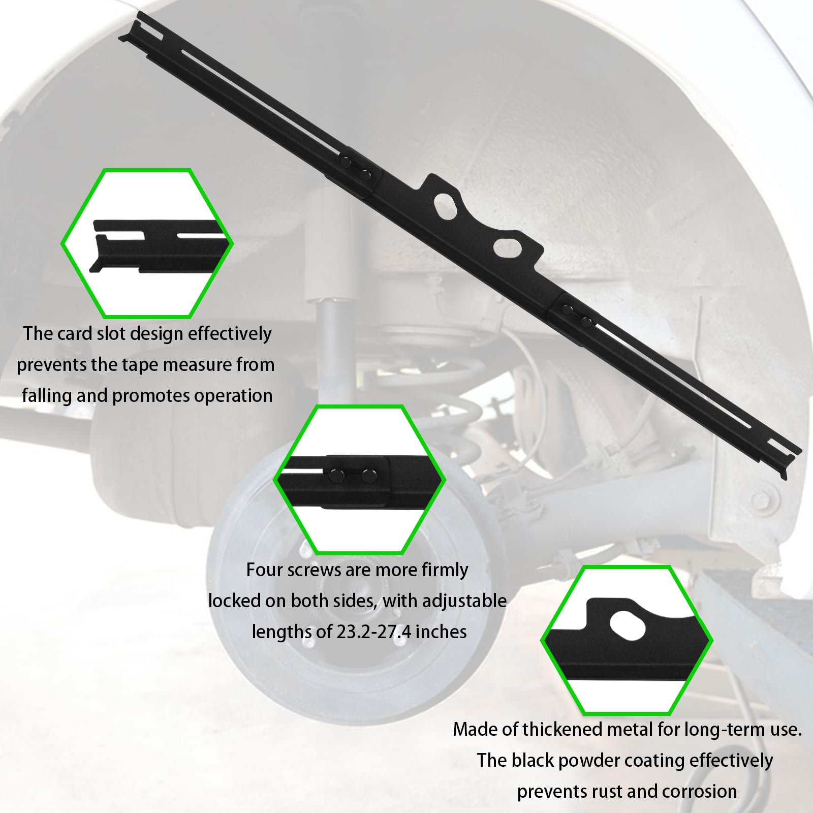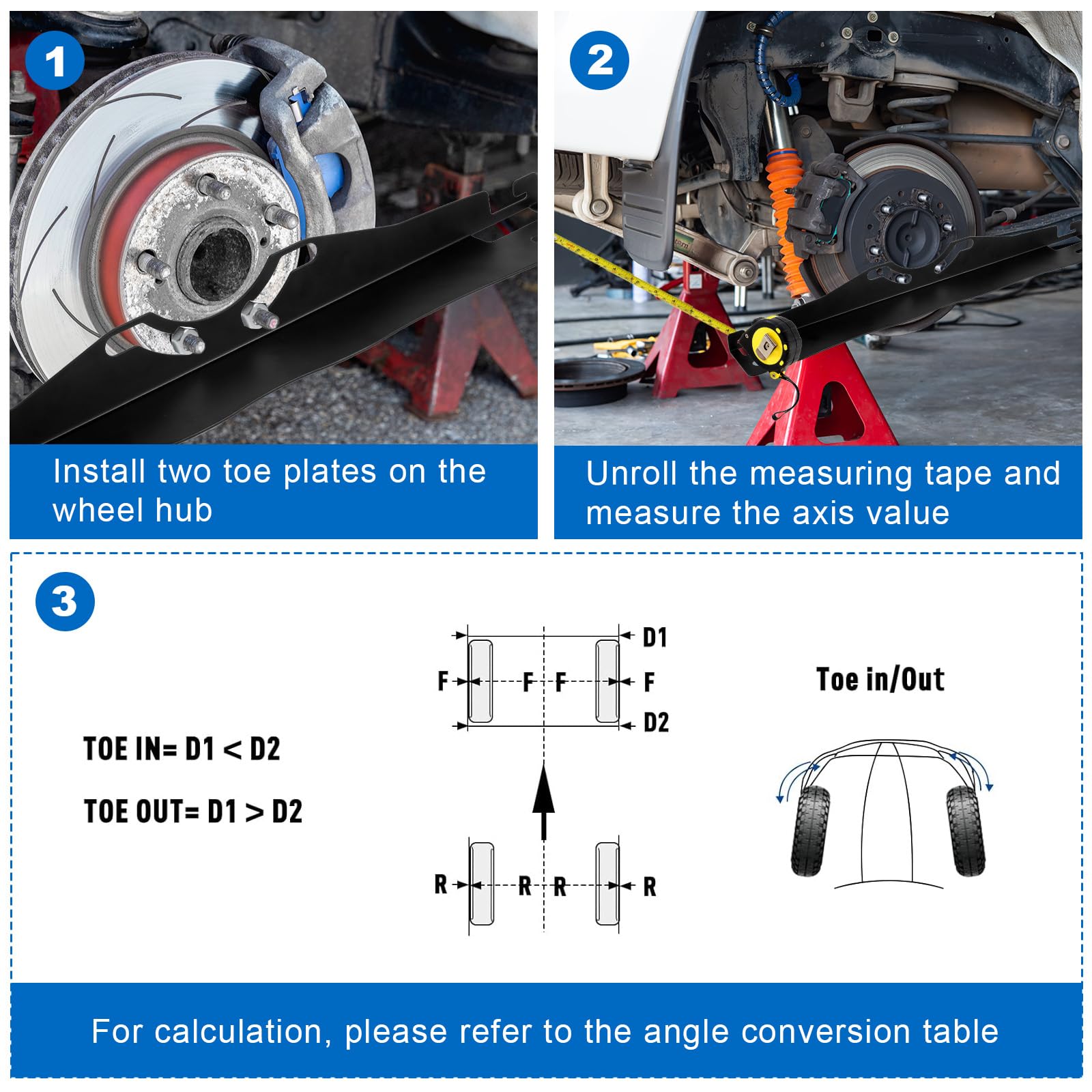 Lot de 2 outils d'alignement de roues robustes, plaques d VANROUG Plaques d'outils d'alignement des roues, plaque d' alignement des orteils en métal, outil d'alignement des roues, outil d' alignement des orteils de voiture, kit d'outils d'alignement des roues Il suffit de démonter la roue, d'installer l'outil d'étalonnage sur le corps du pneu, d'étendre le mètre ruban et de le placer à la baïonnette aux deux extrémités de l'outil d'étalonnage, et de le mesurer et de l'ajuster Design unique de fente pour carte : le design anti-chute permet à nos outils d'étalonnage de maintenir l'outil de ruban à mesurer solidement en place, empêchant les mouvements inutiles et la non-erreur lors des mesures indépendantes, favorisant un fonctionnement efficace d'une seule personne. Excellente durabilité : l'outil d'alignement des roues est fabriqué en excellente plaque d'acier renforcée, ce qui empêche efficacement la déformation, a une haute dureté et une bonne protection contre la rouille, et augmente la durée de vie de l'outil d'étalonnage de roue. Ces plaques d'alignement VANROUG, c'est l'outil malin pour vérifier le parallélisme de vos roues à la maison ! En acier traité antirouille, avec rainures et suspension pour stabiliser le mètre ruban (non fourni Mesure précise : mesurez facilement et rapidement la distance entre l'avant et l'arrière de la roue coaxiale, assurant efficacement une mesure et une inspection précises. GUNSON - JEU DE PLAQUES ROTATIVES D'ALIGNEMENT DES ROUES (2 PIÈCES... Détecte et comprend l'état de sécurité du véhicule, améliore la sécurité et la stabilité de conduite, et effectue des ajustements basés sur des mesures précises Design amovible pratique, facilite le rangement et réduit l'espace de rangement (ruban à mesurer non inclus dans les produits achetés)