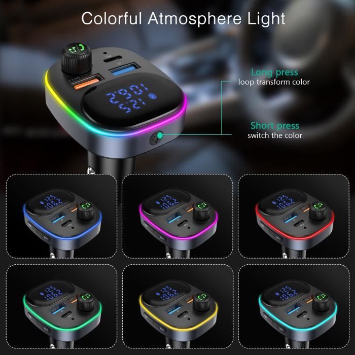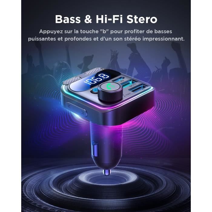 Plage de fréquences FM : 87,5-108,0 MHz ) Portée Bluetooth : 5-10 m Fréquence FM : 87,5-108 MHz Dimensions du Colis : 6,2 × 4,8 × 13 cm Poids: 50g Contenu du Colis : 1 * Transmetteur FM 1 * Manuel d’Utilisation Achetez ORIA Transmetteur FM Bluetooth 5.3 pour Voiture, PD 30W et QC3.0 18 W, Chargeur de Voiture Rapide, Adaptateur Radio sans Fil, Kit de Voiture avec Lumière d'Ambiance LED, Appels Mains Libres Largement compatible : notre adaptateur transmetteur FM Bluetooth 5.3 est adapté aux radios embarquées, transmettant les appels, la musique MP3 et la voix du téléphone portable aux haut-parleurs de la voiture Gérez facilement vos appels avec un seul bouton : appuyez brièvement pour répondre, appuyez longuement pour rejeter et double-cliquez pour recomposer, pour une conduite plus sûre et plus confortable ORIA Émetteur FM Bluetooth 5.3 pour Voiture, Adaptateur La lumière d'ambiance ajuste automatiquement sa luminosité à la mise sous tension, créant une atmosphère animée. Écoutez votre musique via Bluetooth ou une clé USB (jusqu'à 64 Go), compatible avec les formats MP3, WAV, APE et FLAC, avec lecture de la mémoire même hors tension Emetteur Bluetooth Appareil Bluetooth Pour Voiture Transmetteur FM - Bluetooth - Adaptateur Radio - Mains Libres - QC3.0 - Lumière Colorée - Auto Bluetooth Voiture Adaptateur Allume-cigare Charge Rapide PD30W FM Le port USB prend également en charge la lecture de musique sur clé USB pour plus de commodité , Technologie Bluetooth 5., 3 Stable: Équipé de la technologie Bluetooth 5., 3 avancée, cet adaptateur Bluetooth pour voiture offre des connexions plus rapides et plus stables avec reconnexion automatique, éliminant ainsi les appairages répétés. Description du produit Caractéristiques : 1., Ce transmetteur FM est doté d'un port PD (30 W) et de deux ports USB (18 W + 5 V/2,4 A) pour une charge rapide et la lecture de musique depuis une clé USB 2., Le Bluetooth 5., 3 assure une connexion stable avec reconnexion automatique, tandis que la réduction du bruit CVC offre un son plus clair 3., Le micro intégré permet les appels mains libres grâce à des commandes simples pour répondre, rejeter et recomposer des appels 4., Une lumière changeante ajuste automatiquement la luminosité et se synchronise avec le volume de la musique pour un effet dynamique 5., La puce intelligente optimise la vitesse de charge grâce à de multiples protections et prend en charge la lecture de musique via Bluetooth ou USB (64 Go max) Spécifications : Bluetooth : V5., 3 Puissance QC3., 0 : 18 W (max. ) Puissance PD : 30 W (max.