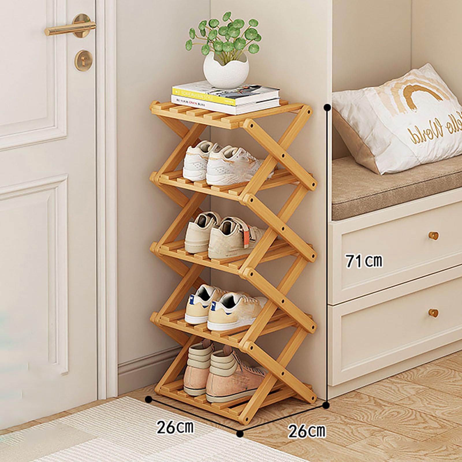 【Facile à installer et à transporter】Cette étagère à chaussures pliante ne nécessite aucune installation : il suffit de la déplier et de commencer à organiser ! Design peu encombrant : mesurant 25,4 x 25,4 x 71,1 cm, cette étagère à chaussures peut stocker jusqu'à 5 paires de chaussures tout en occupant un petit espace au sol, idéale pour les entrées et les couloirs. Caractéristiques : Nom de l'article : étagère à chaussures à 5 niveaux. 【Stabilité de la structure en X】Le design de cette étagère chaussure bois présente une structure en X avec des renforts transversaux, ce qui lui confère une plus grande stabilité que les étagères à chaussures moins structurées. Design en forme de X pour plus de stabilité : l'étagère à chaussures verticale adopte une structure en forme de X pour augmenter la stabilité et la durabilité avec une forte capacité de charge. Étagère à chaussures pliante à 6 niveaux, étagère à chaussures pliante 【Solution D'économie D'espace】 Avec seulement 10 pouces de large et 28 pouces de haut, cette étagère à chaussures verticale est parfaite pour les espaces restreints, pouvant contenir jusqu'à 5 paires de chaussures et prenant très peu de place dans les couloirs étroits, les garde-robes ou les dortoirs 【Construction en bambou de haute qualité】Fabriqué en bambou durable, ce petit meuble à chaussures pour l'entrée combine un design respectueux de l'environnement et une durabilité exceptionnelle. Etagere a chaussures/armoire a chaussures en couleur naturelle avec 3 couches convenant a 9x paires de chaussures. Materiau : bambou. L'etagere a chaussures peut etre facilement et rapidement montee ou pliee. Dimensions : environ 70 x 28 x 52 cm. Convient a tous les types de chaussures Meuble Chaussures Sans Assemblage Étagère à Chaussures Pliable En Bambou Pour Petits Espaces 5 Niveaux Pour Entrée, Couloir, Placard, Solution De Rangement (blanc étagère Sans Assemblage Couleur : conforme à l'image., Matériau : bambou. Matériau de qualité supérieure : fabriqué à partir de bambou naturel, notre étagère à chaussures est conçue pour durer. Ce meuble à chaussures en bambou à 5 niveaux offre un grand espace avec des étagères ouvertes pour organiser tout type de chaussures, des baskets aux bottes. Fabriquée en bambou naturel avec barres latérales renforcées, elle garantit une stabilité et une durabilité maximales Sa construction robuste garantit qu'il résistera à une utilisation quotidienne pendant des années à venir. Lorsqu'il n'est pas utilisé, ce support à chaussures haut et mince se plie complètement en une forme plate pour faciliter le stockage ou le transport, parfait pour ceux qui louent et vivent dans des appartements ou qui déménagent fréquemment Caractéristiques : Gagnez du temps et des efforts : aucune installation nécessaire. Même lorsqu'il est entièrement chargé, ce meuble à chaussures vertical conserve un équilibre parfait