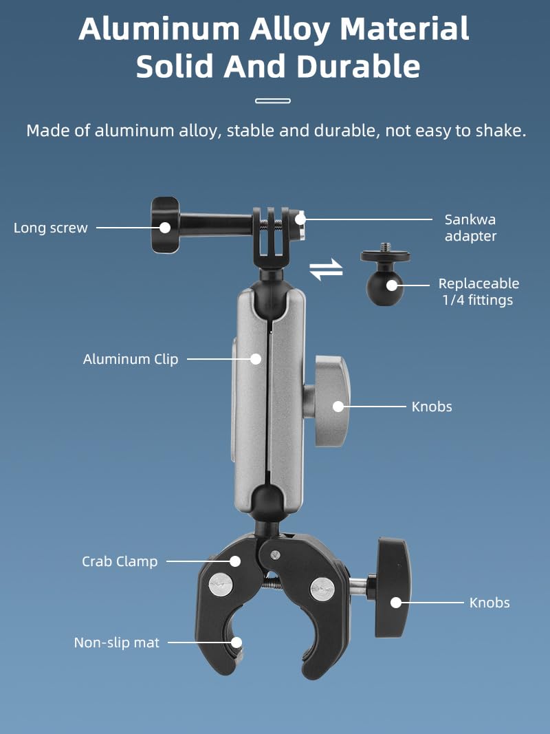 Support de Guidon de oto pour Insta360 X4,X3/X2/One RS, GoPro Hero 12/11/10/9/8/7 Équipé d'un support de boule de rotation à 360°, assurant l'angle parfait et flexible pour chaque prise de vue, permettant des changements rapides de perspective pour des séquences plus dynamiques. Support Guidon Vélo Caméra Action SUREWO Support De Guidon De Vélo En Aluminium, Support De Vélo De Montagne Rotatif à 360 Degrés Compatible Avec GoPro Hero 13/12/11/10/9/8/7/6/5 Noir, DJI Osmo Action 5 Pro/4/3/2 Accessoire VTT Moto Ski Kayak Le design antidérapant à l'intérieur du support de guidon peut protéger vos bâtons contre les rayures. La fixation du guidon de vélo est parfaite pour le vélo, le VTT, le motocross, le ski, le kayak, le SUP surf, les sports nautiques et d'autres activités de plein air. REYGEAK Le support de serrage de guidon est largement compatible, fonctionne avec DJI OSMO Action 4, GoPro Hero 11, Hero 10, Hero 9, Hero 8, Hero 7, Hero 6, Insta360 ONE X3, Insta360 ONE X2 RS, Insta360 G0 3, ONE R et d'autres caméras d'action Équipé d'un support à boule rotatif à 360° qui garantit l'angle parfait et flexible pour chaque prise de vue et permet un changement rapide de perspective pour des images plus dynamiques REYGEAK Support de guidon de vélo pour moto tout-terrain REYGEAK Plage de serrage du support de poteau de vélo à 22-38 mm, ou ajoutez un joint en silicone pour réduire la portée à 9-15 mm. La construction légère et durable empêche le glissement et la casse et minimise les vibrations et les tremblements de l'appareil photo. L'attache de guidon de vélo est parfaite pour le vélo, le VTT, le motocross, le ski, le kayak, le surf SUP, les sports nautiques et d'autres activités d'action de plein air.