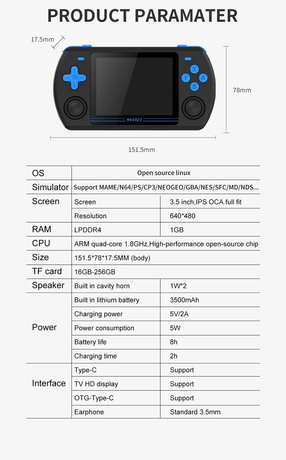 RG353PS Console De Jeu Vidéo 16 + 128 Go Avec 25 000 Jeux Console De Jeu Rétro [Fonctionnement simple] : il suffit de connecter la clé à l'alimentation, de la brancher sur le téléviseur et de passer au canal HD. ROM Carte Mémoire Pour Console , Plug And Play - Appareil Photo La RG353PS est une console de jeu vidéo rétro qui fonctionne sous Linux 64 bits et est équipée d'un processeur RK3566 Quad-Core 64 bits. Elle dispose d'un écran IPS de 3,5 pouces, de 2 Go de RAM et de 32 Go de stockage interne [Grande bibliothèque de jeux] : le système de console de jeu TV classique sans fil est équipé de plus de 30 000 jeux intégrés et de 23 simulateurs préinstallés, de sorte que vous pouvez jouer à tous vos jeux classiques préférés sans avoir besoin de téléchargement ou de connexion Internet. Aucune installation ou installation compliquée n'est nécessaire. C1-128G-2XController - Console de jeu vidéo rétro avec contrôleur C'est un cadeau parfait pour toutes les occasions, y compris les anniversaires et les vacances. Description du produit Plongez dans une expérience de jeu nostalgique avec cette console de jeu rétro sans fil. Avec une immense bibliothèque de jeux et de vrais simulateurs, vous ne serez jamais à court d'aventure pour commencer. [Sortie HDMI haute définition] : utilisez un câble mini HDMI pour connecter la clé à la TV et profiter de jeux vidéo rétro sur grand écran en haute définition. Avertissement De Sûreté Ne pas mettre dans un endroit humide (Le paquet ne comprend pas de piles AAA., ) Poignée améliorée : manette de jeu sans fil 2,4 GHz, vous pouvez jouer à vos jeux préférés depuis le confort du canapé sans aucun fil vous gêner. La poignée sans fil améliorée de 2,4 g garantit un jeu fluide et sans décalage, vous permettant d'embrasser pleinement la nostalgie.