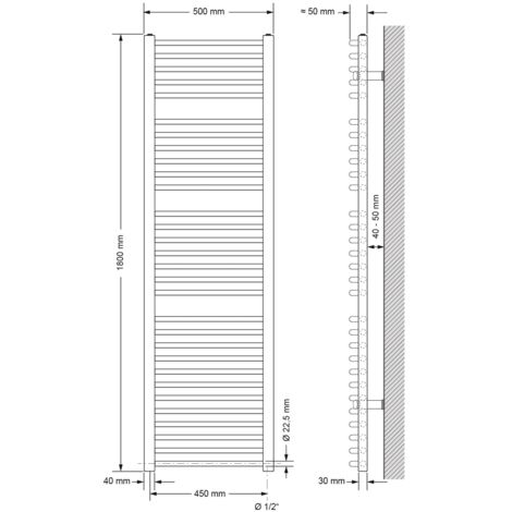 TOP TRAITEMENT: Grâce au traitement, le radiateur est non seulement facile à nettoyer, mais a également une longue durée de vie. POLYVALENT: le radiateur procure non seulement une chaleur et un confort agréables, mais remplit également plusieurs fonctions en même temps. Ecd Germany Radiateur Design Sahara Non Electrique - 500 X 1800 Mm - Chrome - Connexion Central à retrouver en drive ou livraison au meilleur prix dans le rayon Sèches serviettes. Profitez de nos promotions et faites vous livrer ou venez retirer vos courses rapidement dans votre magasin ECD Germany Sèche-Serviettes Sahara Non Électrique - 400 x 1800 mm... CONCEPTION CLASSIQUE: Le radiateur est un radiateur de salle de bains destiné à chauffer la pièce et à chauffer les serviettes. Seche Serviette ECD Germany Radiateur Sèche-Serviettes Sahara - 400 X 1500 Mm Chrom Avec Raccordement Lateral 16731946 Radiateur Electrique Mural Il brille par sa qualité de travail, son design de haute qualité et ses nombreuses applications. INFORMATION TECHNIQUE: Largeur (mm): 500, hauteur (mm): 1800, raccords (mm): 455, diamètre du tuyau: Ø22, profil: 30 * 40 * 1,5 D, puissance calorifique (watt à 75/65/20 °) : 541, quantité d'eau (L): 7,62, poids (kg): 11,46, couleur: chrome, pour diamètre de tuyau 18 à 22 mm; pour un espacement des tubes de 18 à 22 mm; Profondeur (paroi au milieu du tube): 75 à 100 mm; pression de service maximale: 10 bar (1 MPa) Radiateur Eau Chaude ECD Germany Radiateur Design Sahara Non Électrique - 400 X 1500 Mm Anthracite Connexion Central Avec Kit De Raccordement Universal Et Thermostat Forme Courbe Seche Serviettes Salle De Bain Vous pouvez donc utiliser le radiateur également comme sèche-serviettes ou chauffe-serviettes. Contenu : 1 x valve de purge pour radiateur de salle de bain 1/2 bouchon obturateur 1/2 instructions de montage (français non garanti) - Kit de montage mural : 4 supports muraux, 4 vis et chevilles, 4 vis de fixation, 4 rondelles. Pression de fonctionnement maximale : 10 bar (1 MPa) - Pression de test : 12 bar (1,2 MPa) - Profilés verticaux en D 30 x 40 x 1,5 mm - Tubes ronds horizontaux 22 x 1,2 mm - Distance par rapport au mur : environ 6,5 cm.