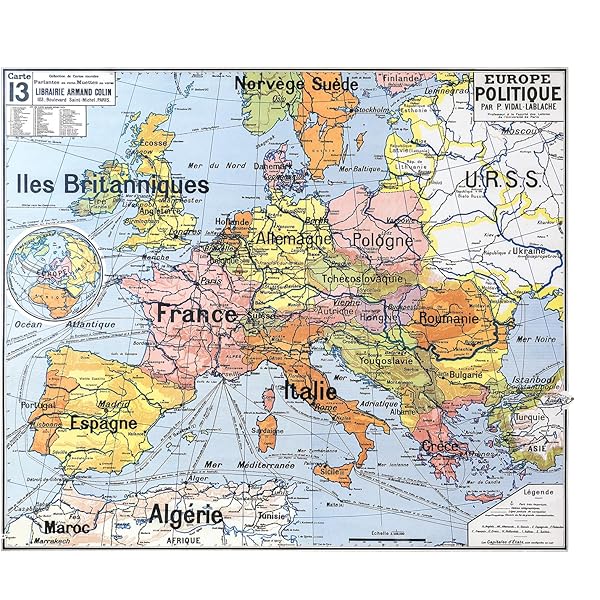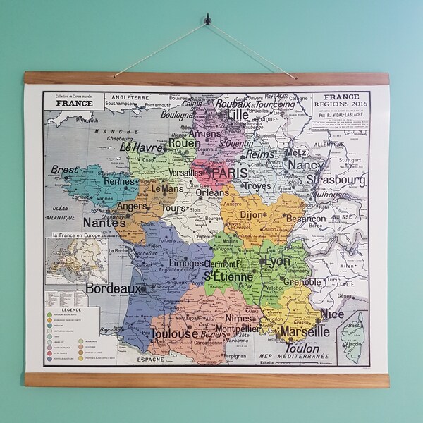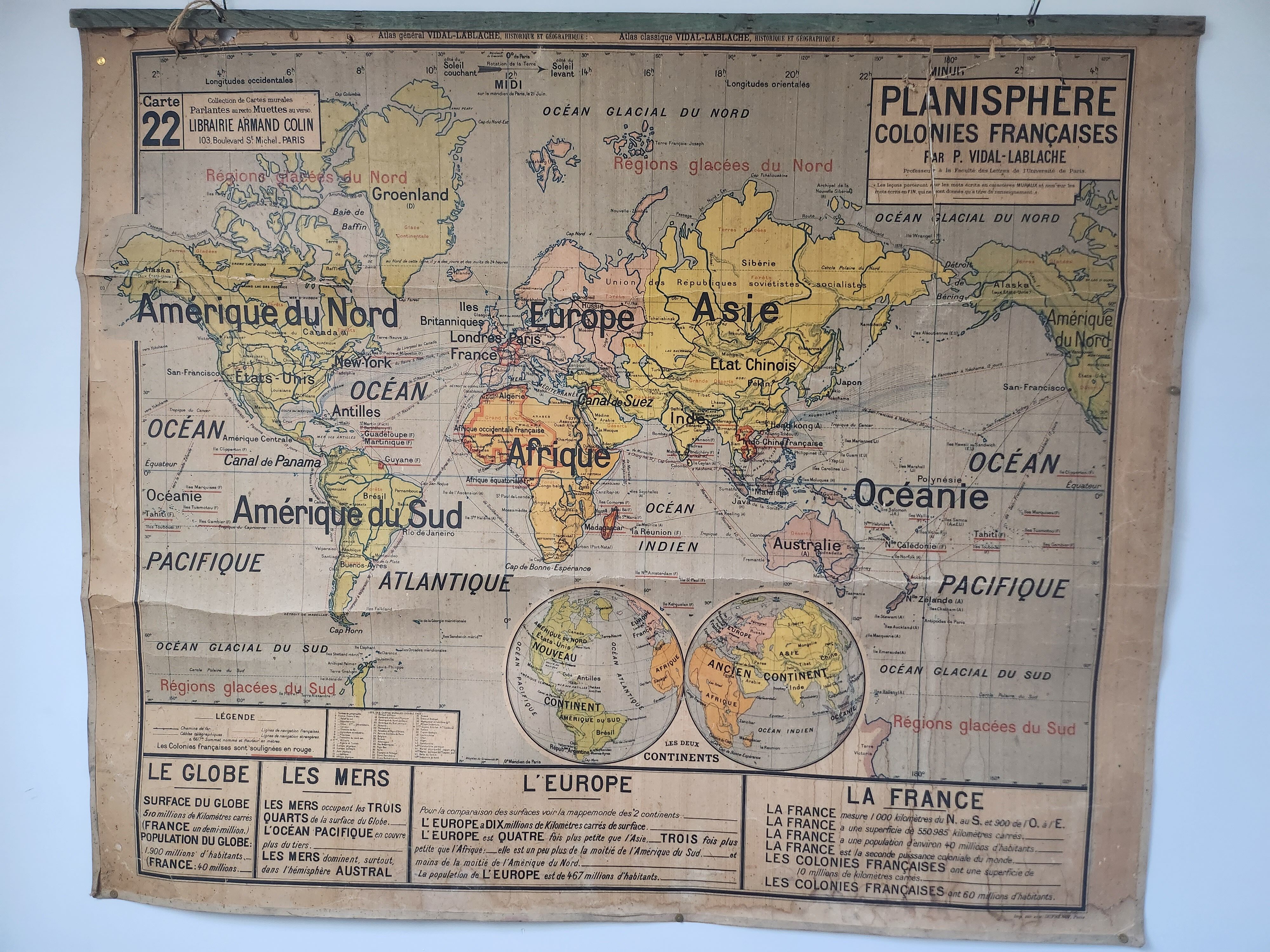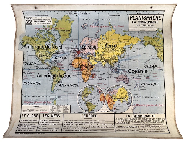 Carte scolaire ancienne Vidal Lablache 22 - Collection Carte Vidal Lablache N° 9 - FRANCE PROVINCES EN 1789-120 X 100 Cm (reproduction Ancienne Carte Affiche scolaire Vidal Lablache N°22 Planisphère La Communauté. Carte en bon état général avec des défauts d'usage visibles sur les photos. Envoi en carton de grande dimension. Remise en main propre possible. Plus d'informations sur simple demande Carte du monde, planisphère, mappemonde et les colonies françaises. Années 50. Dim 120 X 100 cm. Jolie patine, beaux détails. Traces d'usage voir photos dont pliures, tâches... Envoi rapide et soigné contre signature. D'autres modèles disponibles dans ma boutique. CARTE SCOLAIRE vintage MDI : AFRIQUE-AMERIQUE DU SUD