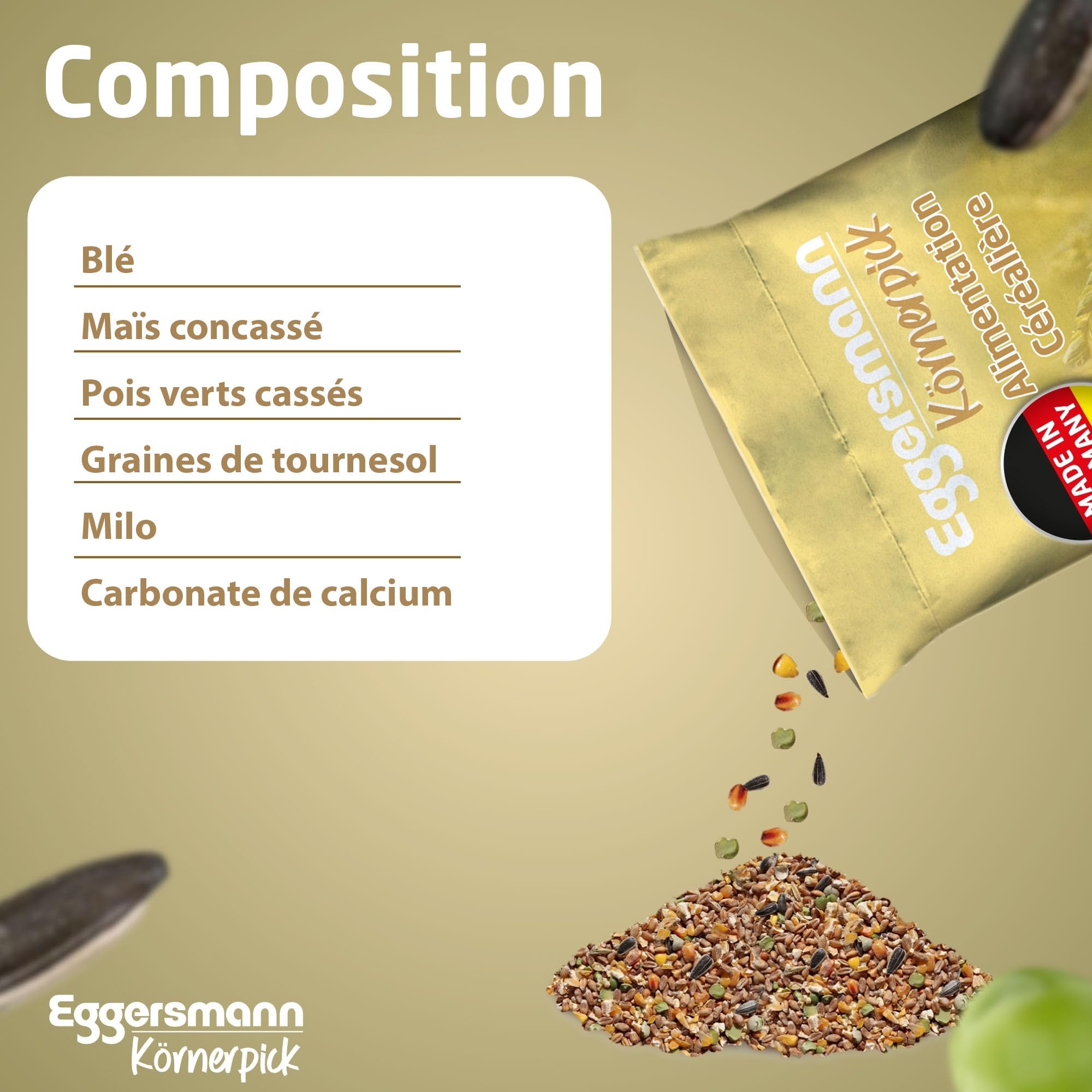 Sorgho (rouge et blanc) : fournit des glucides et des protéines essentiels pour soutenir la croissance et la vitalité. Graines de lin : riche en acides gras oméga-3, favorise des plumes saines et la qualité des œufs. La nourriture peut être saupoudrée aussi bien dans les mangeoires que dans la cour pour les poulets qui marchent librement afin de les encourager à chercher naturellement et à chercher de la nourriture. Ingrédients Avoine pelée Mode d'emploi Donnez la nourriture tous les jours dans le cadre d'une alimentation équilibrée pour les poulets. Favorise le bien-être et la vitalité de vos poules. Indications Tous les âges Ingrédients Composition : flocons de blé, avoine (floquée), arachides, raisins secs, graines de tournesol pelées, flocons de maïs... Nourriture Pour Volaille Mr. Corn Bio Legemehl 10 Kg, Nourriture Pour Volaille Mr Corn Bio Legemehl 10 Kg Nourriture Pour Poules Le dosage doit être adapté au nombre de poulets, à leur âge et à leurs besoins énergétiques, en fournissant constamment de l'eau fraîche. ✔ Idéal pour les poulets en plein air : soutient le mode de vie naturel des poulets et leur fournit les nutriments nécessaires pour l'élevage en plein air. ✔ Ingrédients 100 % naturels - Mélange soigneusement sélectionné sans additifs artificiels, idéal pour la santé de vos poules. Utilisation : nourrissez vos poules tous les jours avec notre mélange de grains équilibré pour leur offrir une alimentation riche et saine. Grains Bio Sans OGM Nourriture Poules Nourriture Pour Poulets ZIVELA 25kg - Mélange De Grains Non OGM Pour Poules, Oies, Canards Galline Ovaiole Nourriture Pour Poules Oies Canards ZIVELA 1 kg de nourriture pour poulets - Graines de volaille - Nourriture pour poules, oies, canards - Sans OGM - 100 % naturel - Mélange de grains 1 kg Favorise une production optimale d'œufs et des plumes saines. Idéal pour tous les types de volailles. Convient à tous les types de poules, y compris pour l'élevage en plein air. Ce mélange soigneusement sélectionné d'ingrédients naturels soutient le bien-être et la santé de vos poules. Avantages : ingrédients 100 % naturels, sans additifs artificiels. ✔ Favorise la santé des plumes et des œufs – Grâce aux acides gras oméga-3 contenus dans les graines de lin, vos poules ont une belle robe en plumes et pondent des œufs de haute qualité.