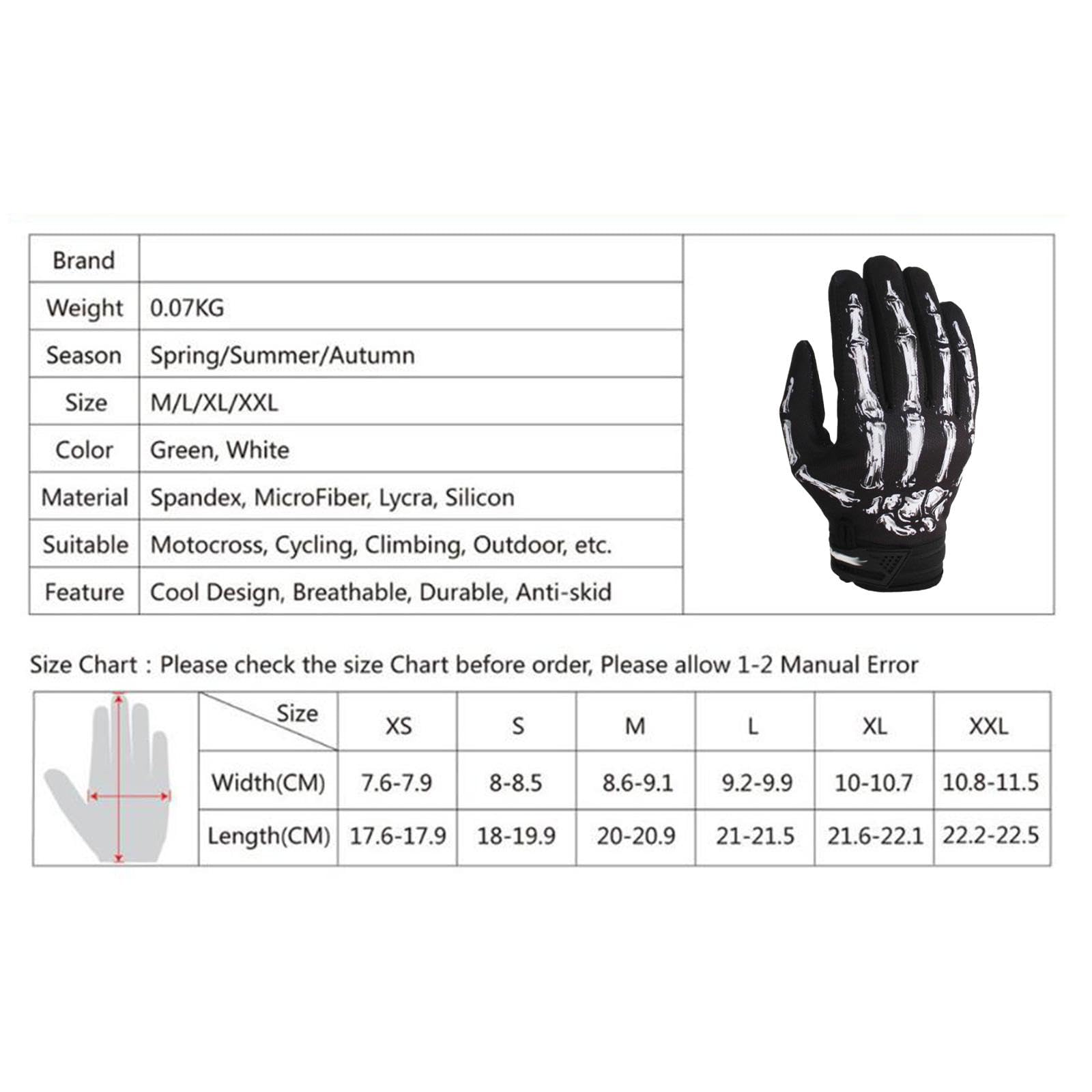 【Application】 Les gants de moto sont parfaits pour le VTT, les courses sur route, le cyclisme, les sports électriques, le motocross, l'escalade, le patinage, l'alpinisme, le vélo tout-terrain et bien d'autres domaines. Description: - 【Matériau】 Les gants de moto sont fabriqués en polyester, microfibre, tissu respirant et confortable, léger et durable - 【Conception antidérapante】 Gants de cyclisme avec microfibre antidérapante sur la paume et sur les doigts, ce qui augmente l'adhérence sur le guidon de la moto pour améliorer la sécurité de conduite - 【Caractéristique】Gants pour moto, randonnée, vélo avec motif de patte de squelette, gants à doigts complets avec manchette élastique - 【Application】 Les gants de moto sont parfaits pour le VTT, les courses sur route, le cyclisme, les sports électriques, le motocross, l'escalade, le patinage, l'alpinisme, le vélo toutterrain et bien d'autres domaines. 【Caractéristique】Gants pour moto, randonnée, vélo avec motif de patte de squelette, gants à doigts complets avec manchette élastique Gants d'équitation Enfant OHLALA 【Mesure】 Veuillez vous référer au guide des tailles en images pour une taille optimale Auto - Découvrez notre offre Gants de vélo à motif de doigt squelette, gants de doigt complets antidérapants, gants d'équitation pour ATV Motocross TailleXL Gants Moto Doigts Complets Gants De Moto à Motif Squelette, Antidérapants, Respirants, Pour Gants Moto Doigts Complets Antidérapants Gants vélo - Sport