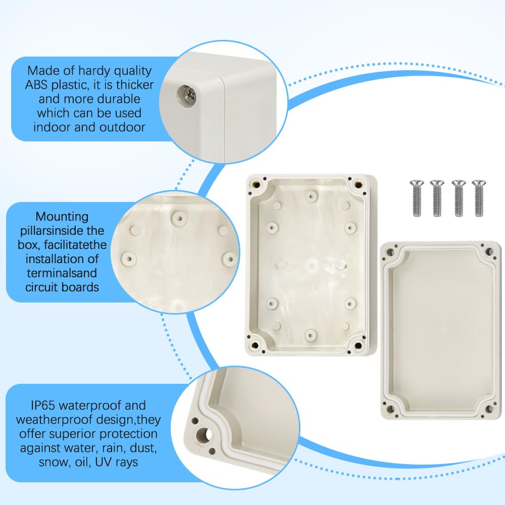 【Non toxique et étanche】: La boîte de jonction est complètement non toxique et ne produit pas de substances nocives. comédie Palpiter prochainement boites de raccordement electrique Semis Innocence Cette boîte est résistante à la poussière et à l'eau, le degré de protection est IP65, bonnes performances d'étanchéité, longue durée de service. Avis clients 【Boîte de jonction de protection IP66】: Cette boîte électrique est résistante à la poussière et à l'eau, le degré de protection est IP66 et pourrait protéger efficacement la boîte. 【Matériau ignifuge】: La boîte de jonction en plastique ABS est faite d'un matériau ignifuge ABS de haute qualité, ce qui garantit une meilleure expérience d'utilisation. Descriptif Les boîtes de jonction sont dotées de presse-étoupes anti-traction accidentelle du câble, de connecteurs à vis. Pré-remplies en gel atoxique et non classé. Ultra compactes et prêtes à l’emploi. Toujours accessibles et réutilisables 【Bonnes performances d'étanchéité The: La boîte de jonction en plastique ABS IP66 a de bonnes performances d'étanchéité, avec une longue durée de service. Le forfait comprend : 1 x boîtes de jonction étanches Remarque : 1., Veuillez permettre une erreur de 1 à 5 mm en raison de la mesure manuelle. Boite De Dérivation Boîte De Jonction Boîtes électriques En Plastique Connecteur De Câble Protection Poussière Eau