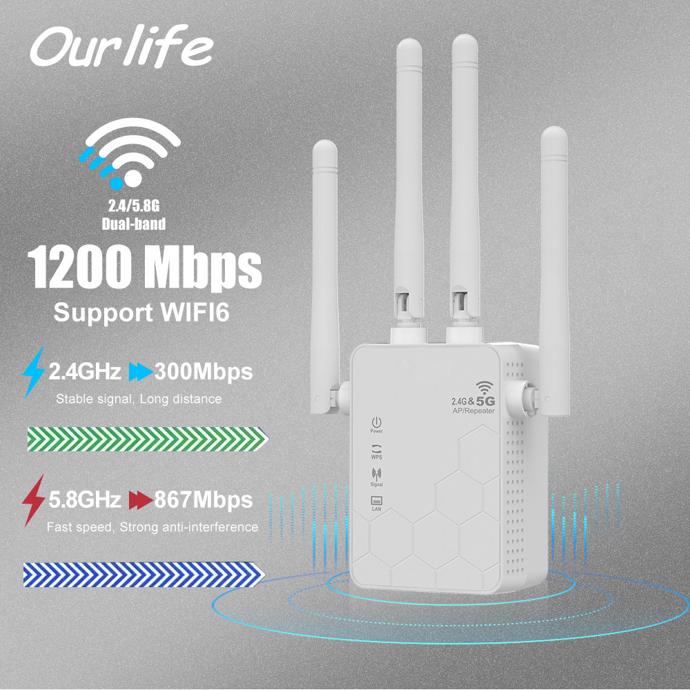 Répéteur WiFi 4 Antennes 2 Ports LAN Répéteur WiFi Sans Fil 1200Mbps, Double Bande 2.4G & 5G Repeteur Wifi Puissant p Un puissant promoteur de wifi domestique étend la couverture de l'internet wi - fi. Dans le même temps, améliorez votre couverture wifi existante. Pages: 1 Une mauvaise connexion au signal peut entraîner une connexion plus lente ou plus faible. 📶 [Universal compatible Security] l'extendeur est compatible avec les principaux périphériques de routeur. La sécurité du réseau est garantie par les derniers protocoles de cryptage wps / WPA / wpa2., Il vous permet de partager votre vie wifi avec votre famille et vos amis et est facile à installer. Les indicateurs LED intelligents aident à les installer dans un emplacement optimal. La couverture Internet Wi - Fi peut être augmentée jusqu'à 2 000 pieds carrés, une plus grande pénétration et aucune perte de signal lors de la traversée des murs, ce qui améliore le réseau wi - fi et vous permet de profiter du Wi - fi dans toute la maison. Caractéristiques p Pourquoi avez - vous besoin d'un amplificateur wifi? Pages: 1 - la couverture du routeur est limitée et le prolongateur wifi convient aux grandes pièces, aux bureaux, aux Villas p Il y a des endroits où les réseaux comme multicouches ne peuvent pas être couverts ou ont un mauvais signal. Repetiteur Wifi Puissant Sans Fil Amplificateur WiFi Dual Band Pages: 1 le puissant prolongateur wifi offre à votre famille un wifi puissant et stable. La vitesse totale de l'amplificateur Wifi est d'environ 1200mps. Minimise la perte de transmission de données, vous permettant de profiter du mode vidéo / jeu HD et de l'Internet haute vitesse. Avec une portée sans fil élargie à 120 pieds carrés, il ne sera plus affecté par un signal faible p Car il peut être hors de portée. Pages: 1 - Application répéteur wifi en trois modes pour répondre à vos besoins quotidiens. Le répéteur Wifi est équipé de radiateurs sur les deux côtés pour éviter les dommages causés par la chaleur. Pages: 1 - Connexion la plus fiable recommandée avec plus de 70% des signaux. Pages: 1 Point d'accès WiFi et client WIFI avec allocation automatique d'adresses IP (DHCP) p Transmission de protocole basée sur le Protocole IPv4 / address Analysis p le nom de réseau (SSID) du point d'accès WLAN doit être configuré pour être visible p le mot de passe de votre répéteur est le même que celui de votre routeur. La vitesse totale de l'amplificateur Wifi est d'environ 1200mps. Achetez 5G Repeteur WiFi sans Fil 1200Mbps Amplificateur WiFi,4 Antennes,Répéteur WiFi avec 2 Ports LAN Gigabit,Couvrant de 10000 sq.ft,Répéteur WiFi/Routeur/AP 3 in 1,pour la Maison et Le Bureau p - Configuration requise du système wifi extender: p les clients WLAN doivent prendre en charge au moins la norme de chiffrement WPA. Il augmente la couverture et vous fournit un signal stable.