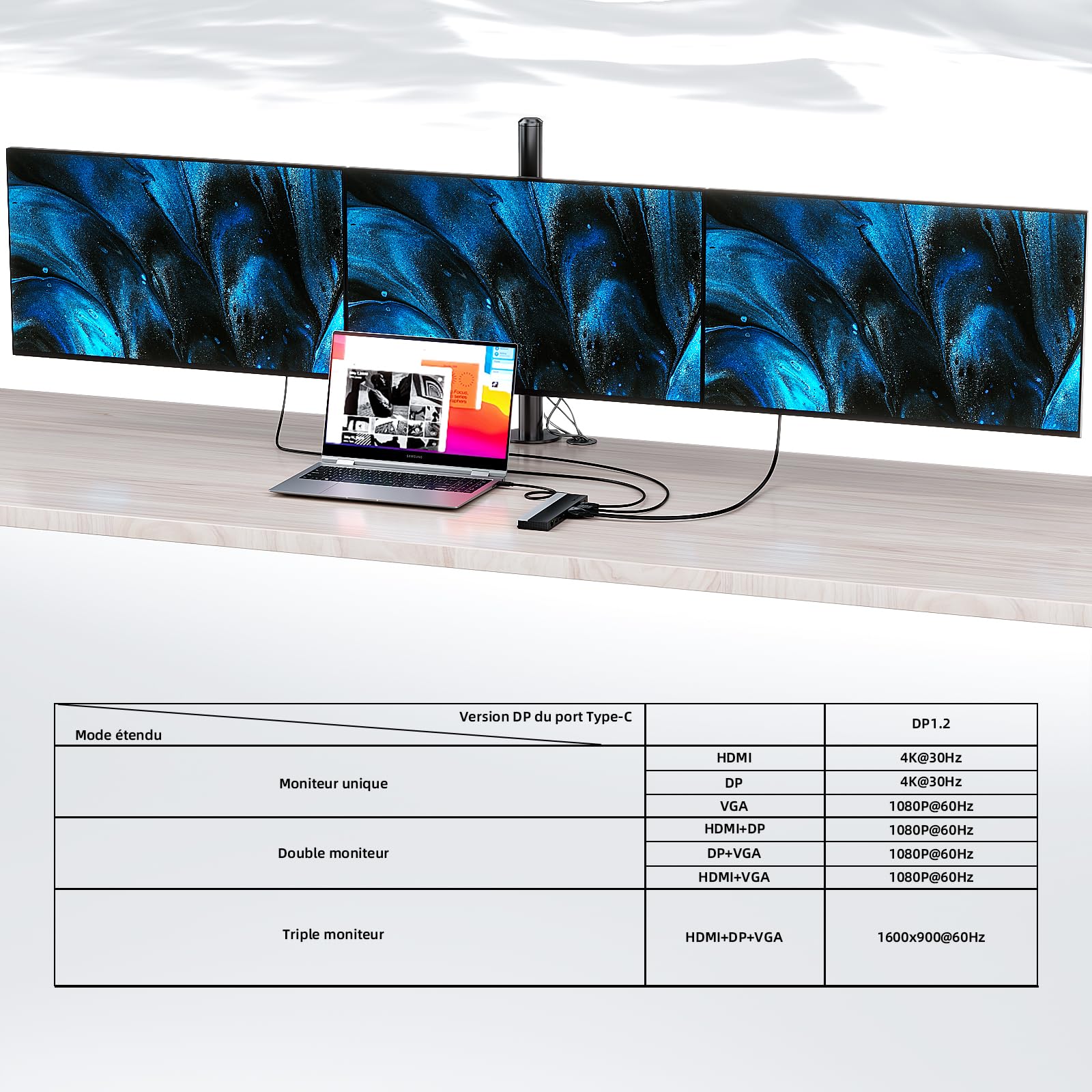 Nos produits sont livrés sans chargeur, veuillez utiliser un chargeur 20 V/5 A/100 W. WAVLINK Station d'accueil USB-C 3 moniteurs avec HDMI, DP, VGA, 100 W PD, USB3.0&2.0, RJ45, emplacements SD/TF, Audio/Microphone, pour Lenovo/HP/Dell, etc WAVLINK Station d'accueil USB-C 3 moniteurs avec Vidéo de marchand Port Gigabit Ethernet RJ45 pour une connexion plus stable et plus rapide. Pour certaines cartes graphiques qui ne prennent en charge que 3 moniteurs, vous devez éteindre l'écran hôte. Le port de type C de l'appareil hôte doit prendre en charge la sortie vidéo et la fonction de charge, veuillez utiliser un chargeur 20 V/5 A/100 W (non inclus). Il a toutes les fonctions dont vous avez besoin Station D'Accueil Usb C Double Moniteur-Triple Moniteurs, Station D Station d'accueil avec alimentation 100 W, 85 W pour charge d'ordinateur portable. Si vous me demandez quelle est la solution ultime, c'est bien cela. Si vous souhaitez élargir l'écran, choisissez-le Meilleure station d'accueil pour ordinateurs portables Moniteur Portable WAVLINK Station D'accueil USB-C 3 Moniteurs Avec HDMI, DP, VGA, 100 W PD, USB3.0&2.0, RJ45, Emplacements SD/TF, Audio/Microphone, Pour Lenovo/HP/Dell, Etc. - Gris Station D'accueil Usb C Il peut étendre 3 écrans, 1600 x 900 @ 60 Hz ; il peut étendre 2 écrans, 2 x 1080p ; il peut étendre 1 écran, 4K @ 30Hz (HDMI ou DP).