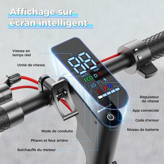Ne manquez pas la trottinette électrique pliable Urbanglide 100 MAX à Débridage Trottinette électrique Pliable HOVERMAX H85F 350 W Avec Contrôle Par Application Pour Adultes EVERCROSS EV85F La trottinette électrique est également équipée d'un feu avant LED et d'un feu d'avertissement de freinage arrière, pour permettre une conduite sûre, surtout la nuit. Avec une portée allant jusqu'à 30 kilomètres sur une seule charge. Clignotants intégrés et fonctions de sécurité complètes : pour une sécurité maximale de jour comme de nuit, la trottinette électrique dispose de clignotants intégrés – essentiels pour rouler dans les trafics occupés ou par mauvais temps. EN STOCK : Trottinette électrique pliable iscooter i9 - pneus 8,5 pouces, moteur 350w, batterie 7,5ah, 30 km d'autonomie, 30 kmh, application - noir I9 pas cher - Retrait & Livraison - Paiement 4X disponible. Loisirs extérieurs à prix discount Application intuitive pour un contrôle complet : avec l'application qui l'accompagne, vous serez toujours informé de toutes les données importantes de la trottinette électrique : plage actuelle, niveau de charge, vitesse et historique de conduite. Trottinette électrique Pliable pour Adultes, 8,5 in avec Clignotants, Batterie 36V 10Ah, autonomie Max. de 30km, Moteur Max. 650W, Doubles Freins, pneus nid d'abeille incrémentaux, Charge 120kg 【Sécurité de conduite de nuit】Système de freinage auxiliaire électronique avant, plus conception robuste de pneu anti-crevaison, pour une conduite plus sûre. Une fonction de verrouillage est également incluse pour protéger votre appareil contre le vol lorsque vous avez besoin de le garer brièvement (par exemple, lors de vos courses ou dans un café).