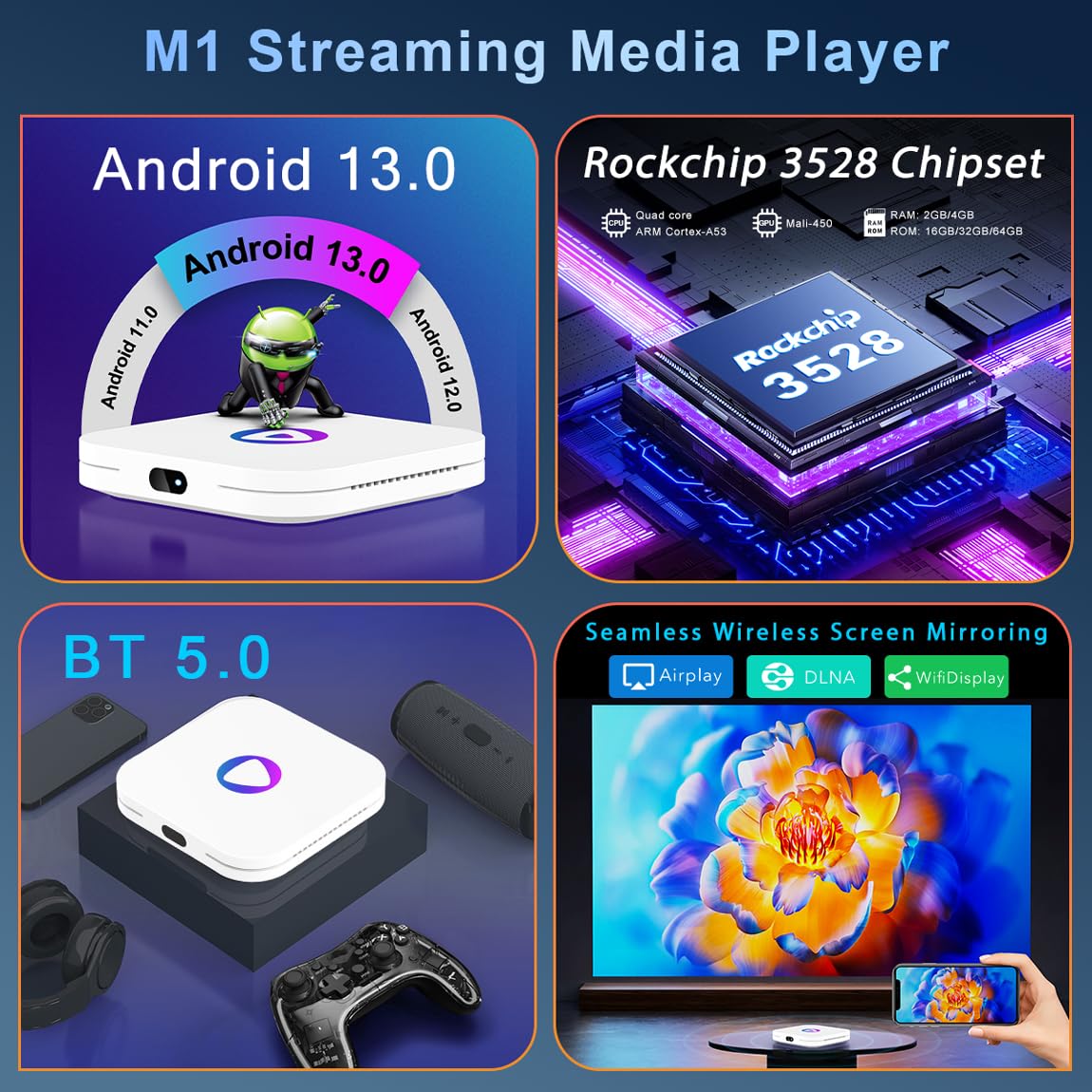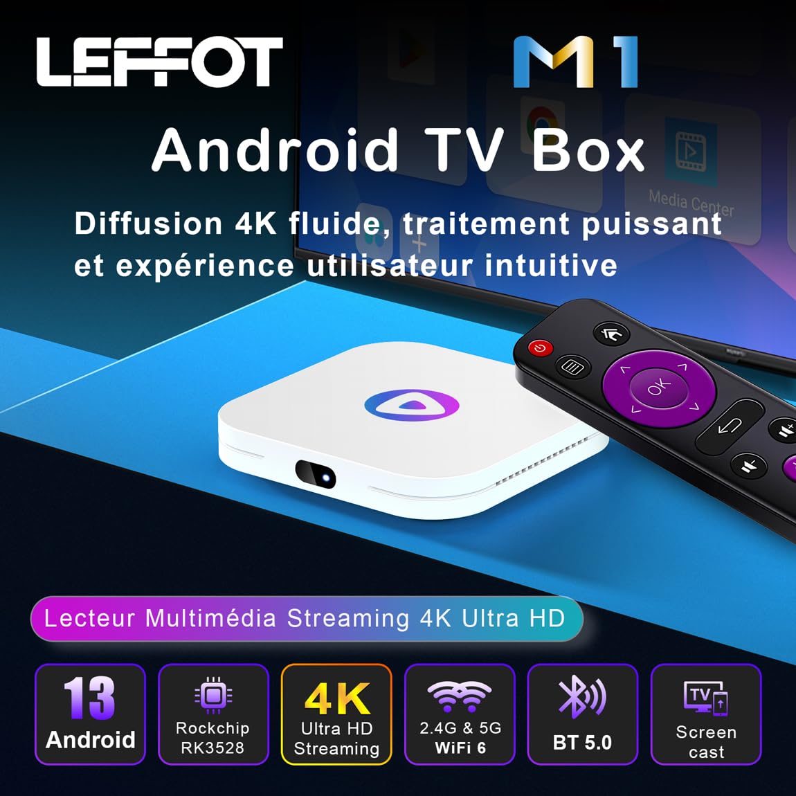 LEFFOT Android 13 TV Box 2025, M1 4K Ultra HD Boitier TV Android, 4Go RAM 32Go ROM, Boitier IPTV, Soutien HDR10, 2.4G & 5G WiFi 6, BT 5.0, Rockchip RK3528 Quad Core A53 WiFi6 ultrarapide : La connexion dual-band 2., 4G/5G avec norme ax offre un débit stable pour du 4K sans buffering, idéal pour le gaming cloud et les vidéos UHD même avec plusieurs appareits connectés. Android Tv Android 14.0 TV Box, LEFFOT 4K Ultra HD Streaming Box, IPTV Box With Android TV Box 4Go RAM 32Go ROM Spécifications: Nom du produit: M1 Android TV Box CPU: RK3528 Quad Core ARM Cortex-A53 GPU: Mali-450 OS: Android 13., 0 RAM: 2GB/4GB Stockage: 16GB/32GB/64GB WiFi: 2., 4G & 5G double bande WiFi 6, WLAN 802., 11a/b/g/n/ax Bluetooth: BT 5., 0 Image: HD JPEG, BMP, GIF, PNG, TIF Audio: MP3, AAC, WMA, RM, FLAC I/O: 1HDMI 4K2K UHD Output, 1USB 2., 0, 1IR Receiver, 1DC 5V/2A, 1AV Accessoires: Câble HD, Télécommande BT, Manuel d'utilisation, Adaptateur secteur Décodeur vidéo principal: H. Android 13 personnalisable : Profitez de l'écosystème Android le plus récent avec accès à des milliers d'apps, mises à jour régulières et une interface intuitive que toute la famille peut utiliser facilement., Connectivité universelle : BT 5., 0 + ports HDMI 4K, USB 2., 0, AV et DC vous permettent de connecter périphériques, disques durs ou systèmes audio sans fil comme avec fil pour une installation sur-mesure. Partage d'écran simplifié : Avec Airplay, DLNA et WiFiDisplay, projetez en un clic photos, vidéos et apps depuis smartphones/tablettes vers votre TV pour des moments conviviaux en grand format. Puissance fluidifiée]Doté du processeur Rockchip RK3528 Quad Core et du GPU Mali-450, cette box Android TV assure des performances stables pour le multitâche... Android 14 TV Box 2025, appareil de streaing LEFFOT aroc | Ubuy 265/HEVC pour des couleurs vibrantes et des détails saisissants sur tous les contenus Netflix, YouTube et vos films locaux. Espace de stockage idéal : La configuration 4GB RAM + 32GB ROM (extensible) permet d'installer toutes vos applications préférées depuis Google Play tout en stockant films et musiques sans compromis sur les performances. 265/HEVC 4K@60fps, H.