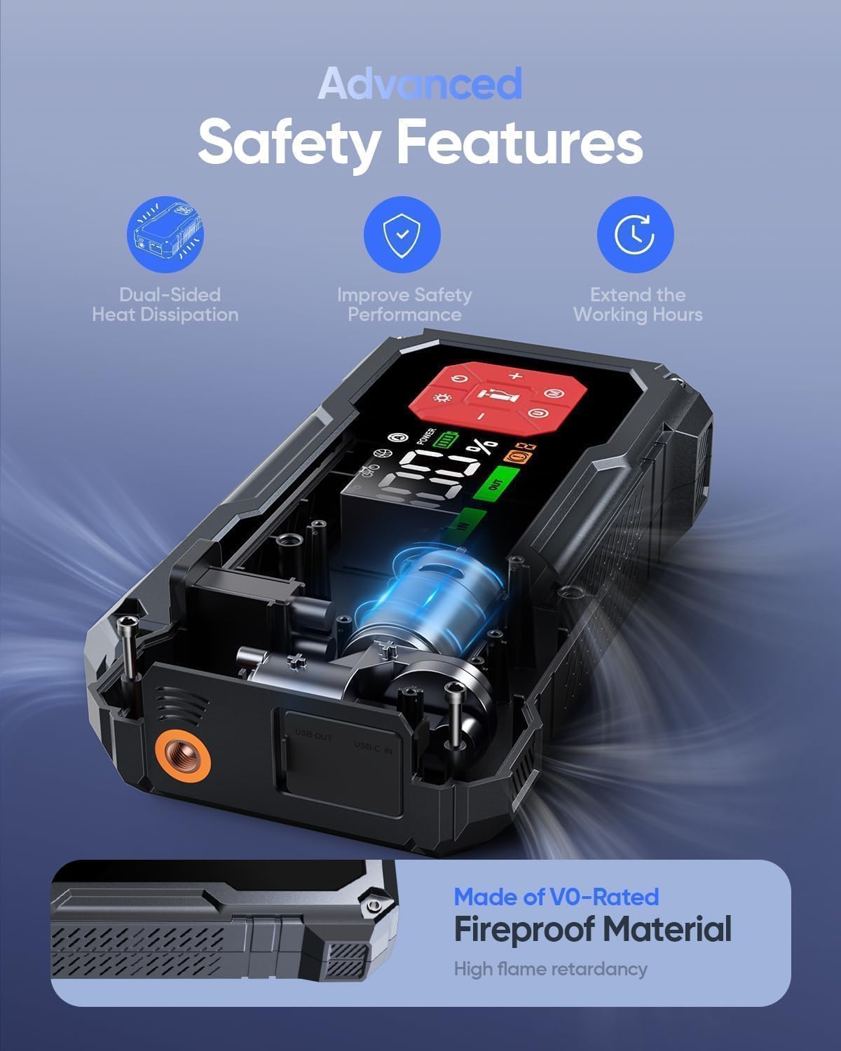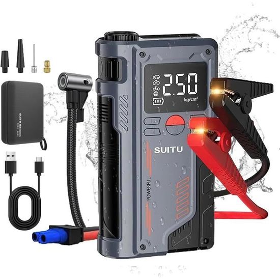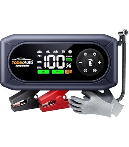 【Compresseur de Pneus Sans Fil 150PSI Rapide】Avec une détection de pression, une fonction d'arrêt automatique et une mémoire automatique, cette pompe à air est facile à utiliser. Il n’est pas nécessaire de deviner ou d’effectuer plusieurs tentatives. La lumière ultra-brillante de 500 lumens offre une grande commodité pour une utilisation nocturne. Il dispose d'une capacité massive de 21800mAh, avec un port de sortie USB 5V/2., 4A, permettant de charger votre téléphone, tablette ou ordinateur portable en déplacement. Ce booster batterie voiture avec gonfleur apporte plus de commodité à votre vie quotidienne et à vos voyages. Le Booster de batterie QS001 est un démarreur de voiture puissant et compact, idéal pour démarrer des véhicules 12V, y compris les voitures, camions, motos et... Booster Batterie Voiture 4000A avec Compresseur à air - Équipement auto 【Lampe LED Multifonctionnelle de 500 Lumens】Le booster voiture batterie démarrage BiuBox BP45 est équipé d'une lampe de poche, avec 4 modes de lumière LED polyvalents : lampe de poche, stroboscope blanc, stroboscope rouge, SOS. Nous nous engageons à rendre vos voyages sur la route plus sûrs. De plus, le mode stroboscope rouge peut servir de feux de signalisation triangulaires, augmentant la sécurité en cas d'urgence sur le bord de la route. Ces protections complètes garantissent votre sécurité ainsi que celle de votre véhicule. Démarreur Batterie Avec Compresseur Air 150PSI Batterie D'appoint Pour Voiture Avec Pompe à Air BiuBox 4500 A 150 PSI (moteur Essence 10 L / Diesel 9 L) – Batterie D'appoint 12 V Portable Avec écran DEL, 10 Protections Compresseur Air 150 Psi Intégré 9-in-1 Booster Batterie Voiture avec 150PSI Gonfleur Pneus, 12V Démarreur Voiture Puissant, Booster Batterie Moto avec 500 Lumière LED 4 Modes, Grand Écran, Gants (Jusqu'à 9L Gaz ou 8L Diesel) YaberAuto 9.8 VOIR LE PRIX 【Protections Multiples de Sécurité】Le boîtier du booster de batterie BiuBox BP45 est fabriqué en matériau V0 haute résistance au feu, garantissant une utilisation et un stockage sûrs même dans des environnements chauds d’été. Ce demarreur batterie voiture est un indispensable dans votre kit d'urgence automobile, vous permettant d'être préparé à toute situation. Les gants isolants inclus ajoutent une couche de sécurité supplémentaire. Booster Batterie Voiture Puissant avec Compresseur d’Air 150PSI, BiuBox 4500A Démarreur Batterie Voiture pour Véhicules 10L Gaz/9L Diesel, Booster De Batterie 12V avec LED 4 Modes, Grand Écran, Gants Le moteur puissant intégré délivre un flux d'air rapide permettant de gonfler rapidement la pression des pneus, atteignant de 28 PSI à 36 PSI en environ 1-minute à 45L/min. Ce booster batterie moto BP45 est idéal pour le camping, les aventures en plein air, les urgences ou les voyages.