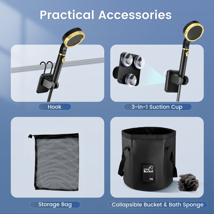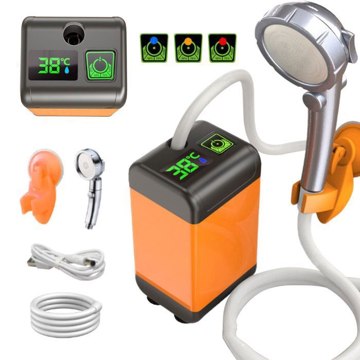 Recharge USB-C en 3-4 heures (compatible powerbank/voiture). Autonomie optimale : Batterie 4000 mAh pour 1 heure de douche continue (suffisant pour 2-3 personnes). Éliminez transpiration et poussière après randonnée, plage ou trek. Recharge complète en 3-4h seulement, suffisante pour 2-3 personnes. Mixte : Flux combiné pour nettoyer le sable ou la poussière tenace. KESSER® Douche de camping avec accu Pompe immergée Douchette 2x 2200mAh... Douche Portable Gohytal Camping Kit, Douche Extérieure Portative 12V Douche Portable Chauffante Rafraîchissement Extérieur Instantané : Votre douche camping essentielle ! La ventouse et le crochet permettent une fixation stable sur surfaces lisses ou arbres, idéale pour votre douchette camping nomade. Profitez d'une douche revigorante en plein air où que vous soyez. Autonomie Prolongée & Charge Rapide : La pompe de douche portable intègre une batterie lithium 4000mAh (60-70 min d'usage). Douche De Camping Portable, Pompe De Douche D'extérieur, Pompe De Douche Dexterieur Pompe De Douche Electrique Rechargeable Avec Affichage Numerique Intelligent Plusieurs Modes De Pulverisation Pour Le Camping La Randonnee L 87712162 C'est exactement ce que la douche de camping portable avec pompe électrique rechargeable offre : une expérience de douche rafraîchissante et simple, où que vous soyez. Elle est conçue pour vous accompagner lors de vos randonnées, voyages, ou simples déplacements, vous offrant ainsi le confort d'une douche à tout moment Pack Inclus Unité principale*1 Pomme de douche*1 Tuyau*1 Sac de rangement*1 Manuel d'instructions*1 Support*1 Câble de charge*1 Parfaite pour le camping, les randonnées, les voyages en camping-car ou une douche rapide après la plage, elle élimine la transpiration, le sable et la poussière en quelques secondes. 3 Modes d'Eau Personnalisés : Cette douchette portable offre un débit optimal (5L/min) avec 3 jets sélectionnables : tournez simplement la poignée. Transformez vos aventures outdoor en moments de confort avec notre pompe de douche compacte. Impulsion : Jet tonique pour un massage revigorant après une journée de marche. Polyvalence Multi-Usage : Bien plus qu'une douche portable, cet appareil sert au lavage auto, arrosage plantes, bain d'animaux ou nettoyage vitres.