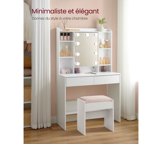 Miroir éclairé par LED 3 couleurs : Le miroir de maquillage de table dispose de 3 options d'éclairage pour répondre à vos besoins en matière de maquillage. YDkjwjw l'ensemble de Coiffeuse avec Miroir LED, 3 Modes de Couleur, Table de Maquillage avec Tiroirs et Tabourets, Meuble Chambre avec Rangements Indépendants, Moderne Les boutons tactiles sensibles permettent de régler la luminosité en appuyant longuement sur le bouton. Le tabouret souple peut être placé sous le meuble de toilette sans prendre de place supplémentaire. Cadeau idéal pour toutes les femmes : La plupart des femmes aimeront cette jolie commode élégante. Miroir Rond Lumière Réglable 3 Couleurs Coiffeuse Avec Miroir Rond Et Tabouret, Coiffeuse Avec Miroir LED à Luminosité Réglable,Table De Maquillage Avec 4 Tiroirs De Rangement, Meuble Coiffeuse Moderne Avec Tabouret Rembourré Le miroir peut pivoter à 360°, vous pouvez ajuster les choix visuels en fonction de vos besoins de maquillage. Set de coiffeuse avec chaise rembourrée : L'ensemble de coiffeuse est durable et stable pour une utilisation quotidienne. De plus, le tabouret rembourré assorti vous offre le plus grand confort lorsque vous vous asseyez dessus pour vous maquiller. Matériau : La coiffeuse est composée d'un plateau en pierre et d'un bureau de visualisation en verre HD, d'un cuir technique imperméable et d'un cadre en métal. Coiffeuse avec Miroir Rond et Tabouret, Coiffeuse avec Miroir LED Le fond utilise des tiges de soutien horizontales et deux tiges de soutien verticales pour améliorer la stabilité. Faites votre choix entre une coiffeuse moderne aux arêtes vives et nettes et une coiffeuse d'aspect ancien aux bords plus doux et arrondis. Nos coiffeuses s'accordent parfaitement avec d'autres meubles de la même série