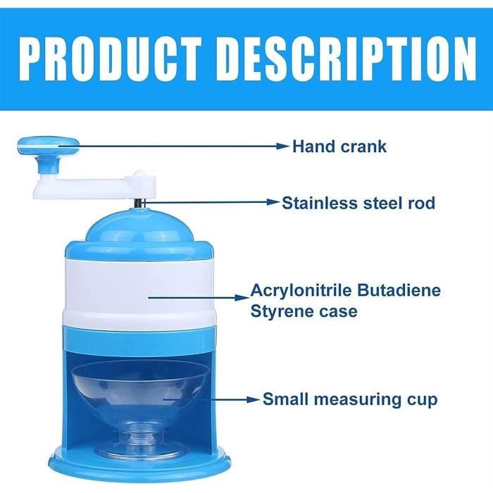 Machine à broyer la glace à rasoir manuel : c'est vraiment un merveilleux rasoir à glace manuel pour un usage domestique, une machine à glace à rasoir manuel Mini machine à glaçons : une préparation facile et rapide de différentes saveurs de smoothies glacés, mini rasoir portable Broyeur à glace manuel : la machine à glace est très compacte et facile à transporter afin que vous puissiez l'utiliser partout où vous allez Rasoir à Glace Manuel Accueil Mini Broyeur À Glace Machine À Glace Pilée Manuelle Comptoir Hachoir Glace Compact Broyeur à glace en acier inoxydable, mini philosophes de glace, hachoir manuel, cône de neige, machine à brûler les nuits de glace, machine à neige fondante Description du produit Contenu du colis : 1 presse-ail Caractéristiques : - Informations sur le produit : coupe-légumes ail - Dimensions : environ 23 x 6 x 6 cm. Robot de cuisine pour cuisine. - Matériau : PP, hachoir manuel en acier inoxydable. - Fabriqué en matériaux robustes et résistants, il dispose d'un presse-ail. - Ce mini hachoir vous permet de hacher les légumes, les fruits et... Broyeur À Glace Manuel - TRAHOO - Machine à glace pilée rapide en acier