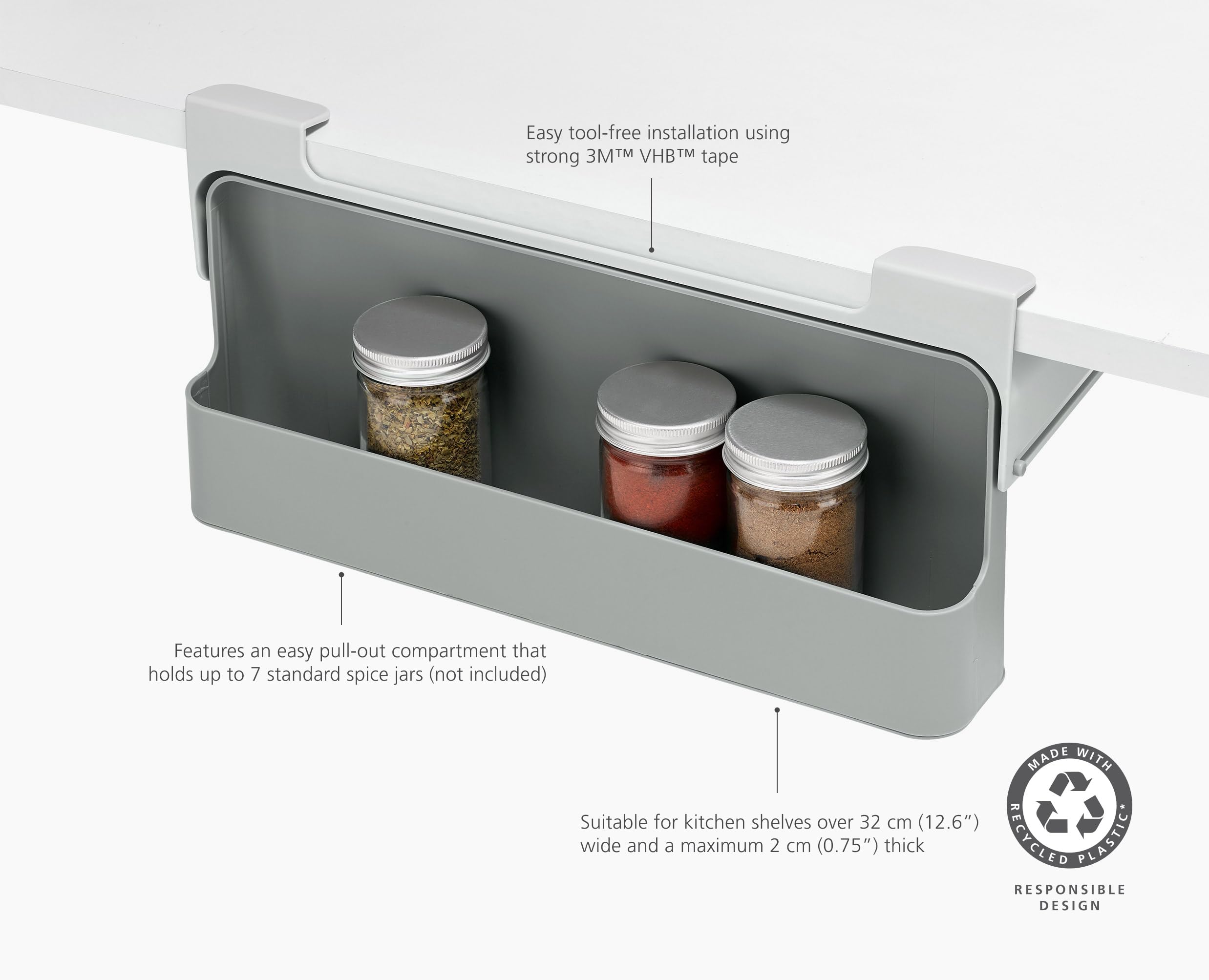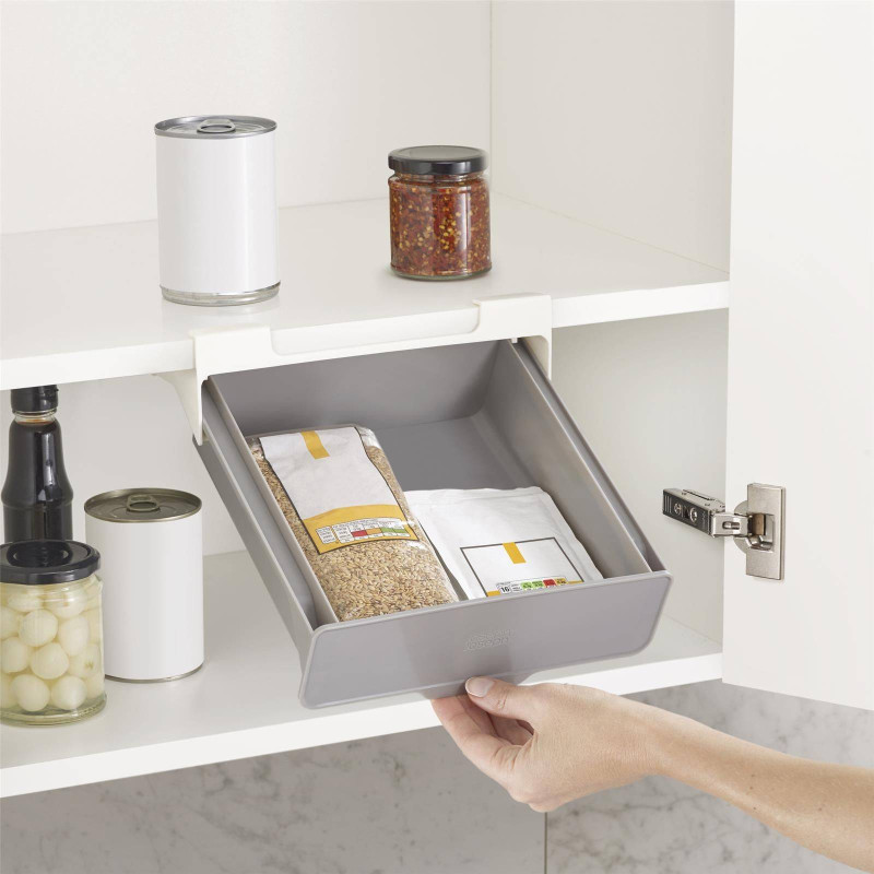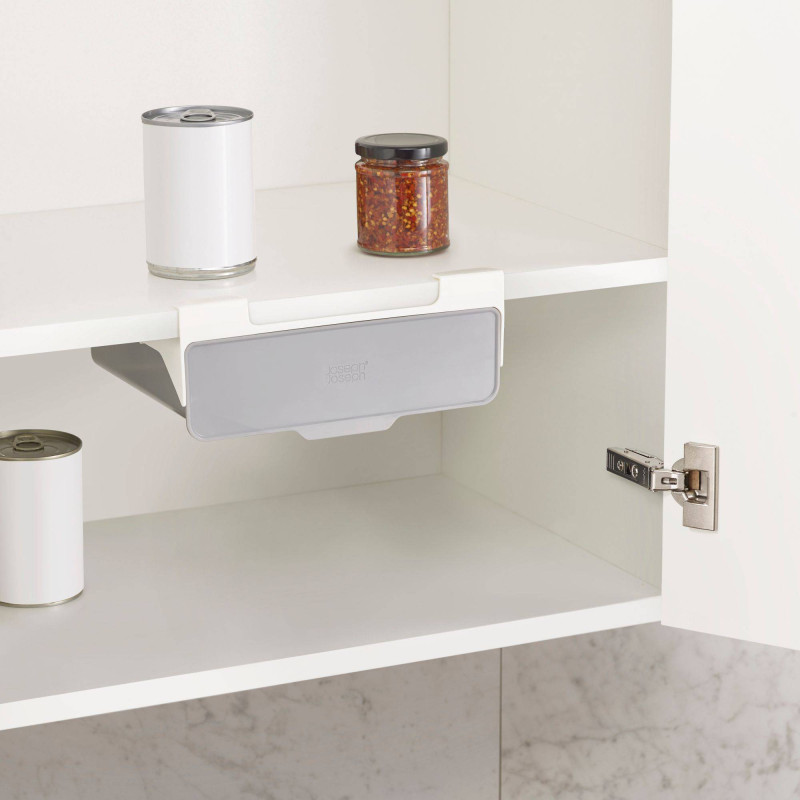 Joseph joseph - Cofet de rangement cupboardstore | Connox Rangement Aluminium Papier Sulfurisé Joseph Joseph CupboardStore : Tiroir Sous étagère - Gris Rangement Placard Cuisine Convient aux étagères de cuisine de plus de 23,5 cm de large et 2 cm d’épaisseur max Optimisez l’espace inutilisé dans vos placards avec ce tiroir astucieux à fixer sous une étagère. L’unité s’adapte parfaitement aux étagères existantes et est facile à installer avec le ruban adhésif 3M™ VHB™ résistant. CupboardStore Rangement tiroir sous étagère pour placard Joseph Joseph Optimise l’espace inutilisé sous les étagères des placards Promo Organiseur D'étagère Extensible CupboardStore Joseph Joseph chez... *Fabriqué avec au moins 50 % de plastique recyclé post-consommation Idéal pour ranger des articles encombrants tels que des cubes de bouillon en vrac, de petits paquets et des tubes de pâte alimentaire, il garde votre cuisine organisée.