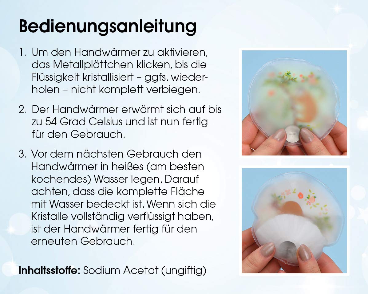 Les chauffe-poches sont réutilisables, il suffit de les placer brièvement dans l'eau bouillante jusqu'à ce que les cristaux soient à nouveau complètement liquéfiés. Chaufferette Pieds Chauffe-Mains Longue Durée, Chauffe-Mains Activés Par L'air,Chauffe-Mains Chaud Portable | Inserts Naturels Inodores Et Durables Pour Chauffe-Chaussures Pour Le Corps, Les Mains Et Les Chaufferette Main Reutilisable MC-Trend Lot de 4 Chauffe-Poches, Chauffe-Mains pour Mains et Doigts Chauds, Coussinets Chauffants réutilisables (Lot de 4 Réutilisables En faisant bouillir brièvement dans de l'eau chaude, les chauffe-mains sont toujours prêts à l'emploi – une source de chaleur durable pour les jours froids Activation facile Pour l'activer, il suffit de plier la plaque métallique et de profiter immédiatement de la chaleur – idéal pour les déplacements et rapidement à portée de main Lot de 4 magnifiques chauffe-mains suricates mignonsCes chauffe-mains sont doux et chauds - Idéal en automne et en hiver contre les mains froidesLes chaufferettes sont réutilisables. Avant la première utilisation, faites attention à environ 8 minutes dans de l'eau bouillante jusqu'à ce que les cristaux se liquéfient complètementDimensions : environ 11 x 7 x 1 cmMatière : acrylique Les chauffe-mains peuvent être activés très facilement en pliant la plaque métallique. Description du produit Chaleur agréable Avec une température de 50 à 55 °C, les coussinets chauffants assurent une chaleur apaisante, parfaits pour les sacs ou les gants Chauffe-poches Activation Pliage Chaufferette,Chauffe-mains électrique Aste Avec Contrôle Automatique De Chauffe-mains Réutilisables