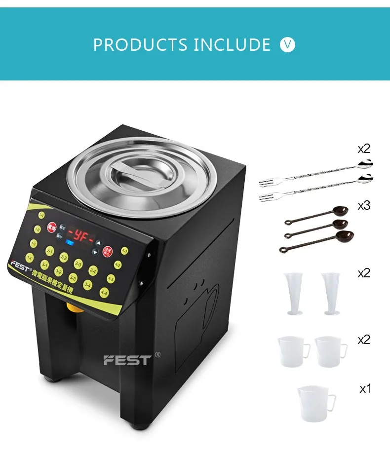 Machine à Sirop Dosage Distributeur Automatique De Fructose 8 L, Machine Machine Pour Bubble Tea 16 réglages de portions programmables : distributeur de fructose contrôlé par micro-ordinateur avec écran LCD et 16 touches de mémoire pour un contrôle précis des portions de sirop et une distribution répétée rapide Multiusos) La machine à fructose quantitative est idéale pour la maison et le travail. C'est un complément idéal pour les magasins de thé à bulles, les cafés, les salons de thé, les boulangeries, les magasins de crème glacée et les hôtels. Voir plus de détails Vous avez des questions à propos des informations du produit en français Convient pour les cafés/thé aux bulles , Capacité : 9 l XEOLEO Fructose machine 8.5L 16 Grille Quantitative automatique Fructose Distributeur distributeur de Sirop de Fruits machine à sucre