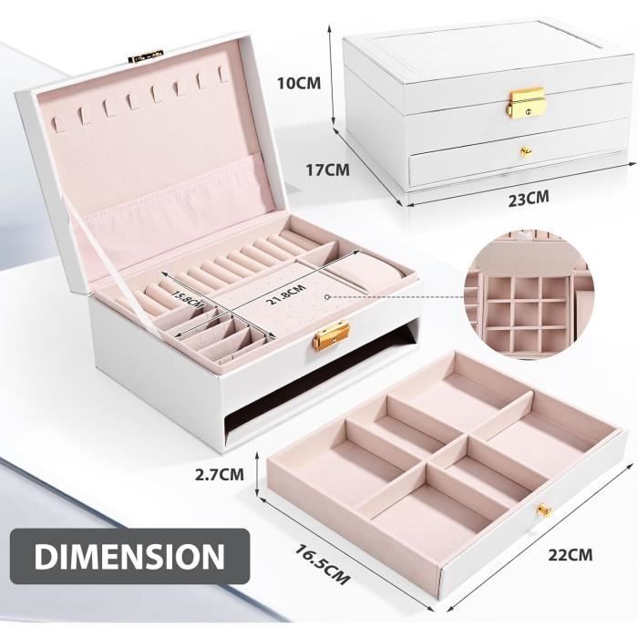 Design spacieux à 3 niveaux : cette boîte à bijoux portable dispose de 3 couches de rangement, y compris 2 tiroirs, offrant suffisamment d'espace pour organiser bagues, colliers, boucles d'oreilles, et plus encore Que ce soit pour honorer votre mère, chérir votre partenaire ou célébrer un ami cher, il reste un choix impeccable qui ne déçoit jamais. Presentoir Bijoux SONGMICS Boîte à Bijoux à 3 Niveaux En Bois D'Ingénierie, Coffret à Bijoux Original Avec Boîte à Bijoux Femme Rangement organisé : la conception à trois compartiments permet de séparer soigneusement les boucles d'oreilles, les bagues et les montres, éliminant ainsi tout encombrement. DESIGN PORTABLE : L'intégration innovante d'un miroir de courtoisie intégré et d'une poignée de transport ergonomique répond aux besoins de toilette en déplacement. Sa légèreté et sa portabilité garantissent que la beauté vous accompagne dans tous vos voyages. Rangement organisé : la conception à trois compartiments permet de séparer soigneusement les boucles d'oreilles, les bagues et les montres, éliminant ainsi tout encombrement Boite Montre Boîte à Bijoux Voyage Vlando - Mini Avec Miroir - Rangement Boucles D'oreilles, Bagues, Chaînes Vlando Boite A Bijoux Voyage LE CADEAU IDÉAL : soigneusement sélectionné pour convenir à diverses relations et occasions. STRUCTURE SCIENTIFIQUEMENT DIVISÉE : conçu à l'intérieur avec trois compartiments de rangement distincts, comprenant des crochets pour boucles d'oreilles, une colonne pour bagues et un coussin pour montres, permettant une organisation harmonieuse et un accès facile. Pratique grâce à son miroir : miroir intégré dans le couvercle pour faciliter les ajustements de style ; poignée supérieure permettant un transport sans effort.