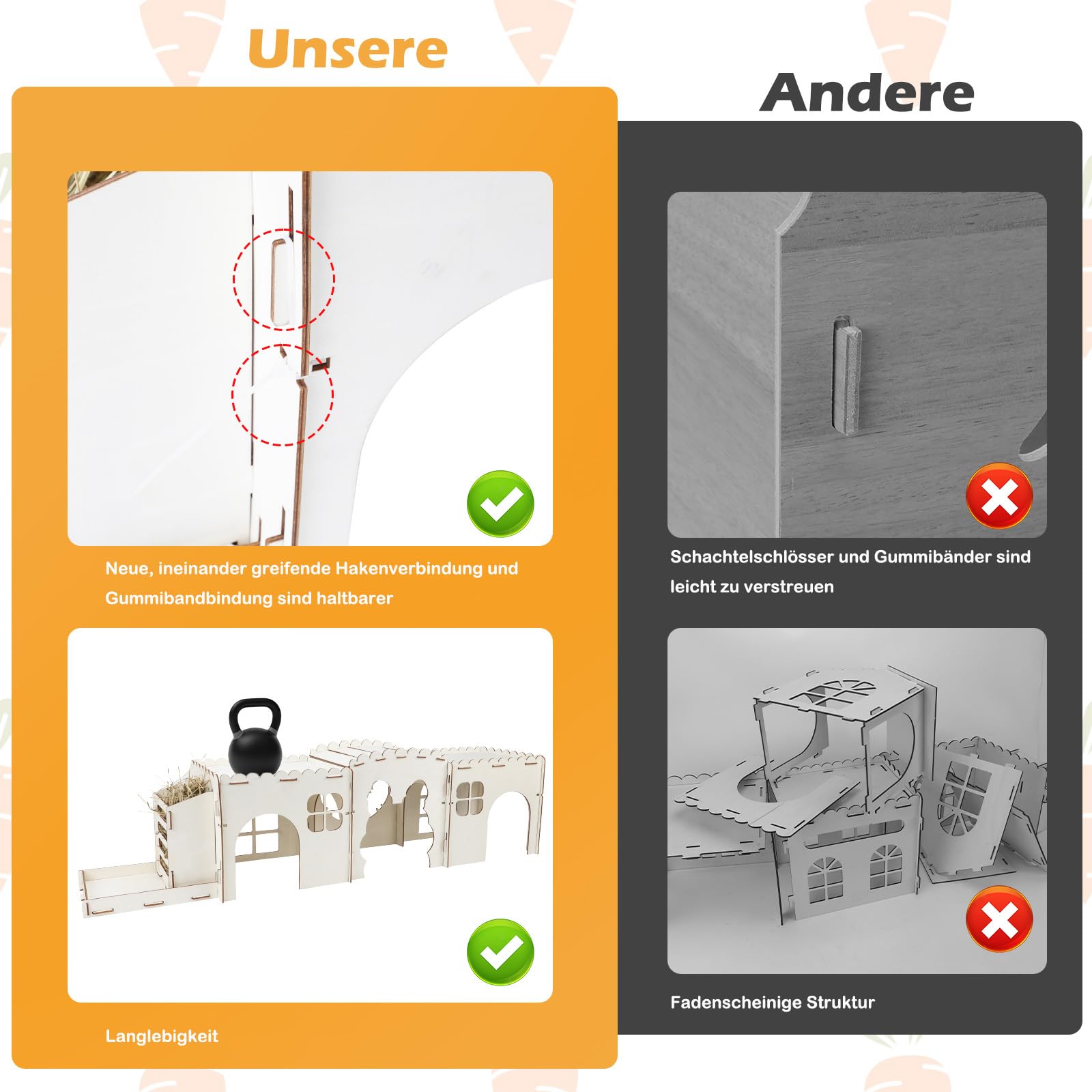 Clapier XXL pour lapins et rongeurs Cabane Pour Lapin Naturelle RANYPET Grande Cachette De Lapin En Bois Avec Ru00e2telier U00e0 Foin, Maison De Jeu Stable Pour Lapin, Chu00e2teau D' escalade, Chu00e2teau En Bois Pour Lapins Et Rongeurs Cabane Tortue Après avoir fixé les joints d'étanchéité en silicone à tous les points d'emboîtement, tout devient stable. Avec 45 joints d'étanchéité en silicone pour fixer toutes les connexions, vous n'avez pas à vous soucier de s'effondrer. Multifonction : il sert à la fois d'aire de jeux pour l'escalade et de la course qui favorise la santé, ainsi que comme espace de couchage et abri pour des périodes de repos détendues. Ce sera un plaisir pour vous et votre animal de compagnie de posséder ce grand château pour lapins de 2 étages, des escaliers et une terrasse, peu encombrant, élégant, léger, facile à transporter Design esthétique : style château européen avec un design multi-chambres à deux étages, un aspect simple et une bonne ventilation, une maison parfaite pour vos animaux de compagnie. Avec ses dimensions de 60 x 30 x 40 cm, il ofe beaucoup d'espace pour l'escalade une fois assembl et est id al pour les lapins, les cochons d'Inde, les hamsters ou les chinchillas. Respirant style ch teau europ en, aspect l gant, plusieurs fen tres d'a ration pour une bonne ventilation, maison parfaite pour les animaux de compagnie Structure robuste : bien qu'il contienne de nombreux composants, l'assemblage est facile en suivant les instructions (français non garanti). Les dimensions après le montage sont de 120 x 35 x 62,4 cm, offrant beaucoup d'espace pour l'escalade et est idéal pour les lapins, les cochons d'Inde, les hamsters ou les chinchillas.