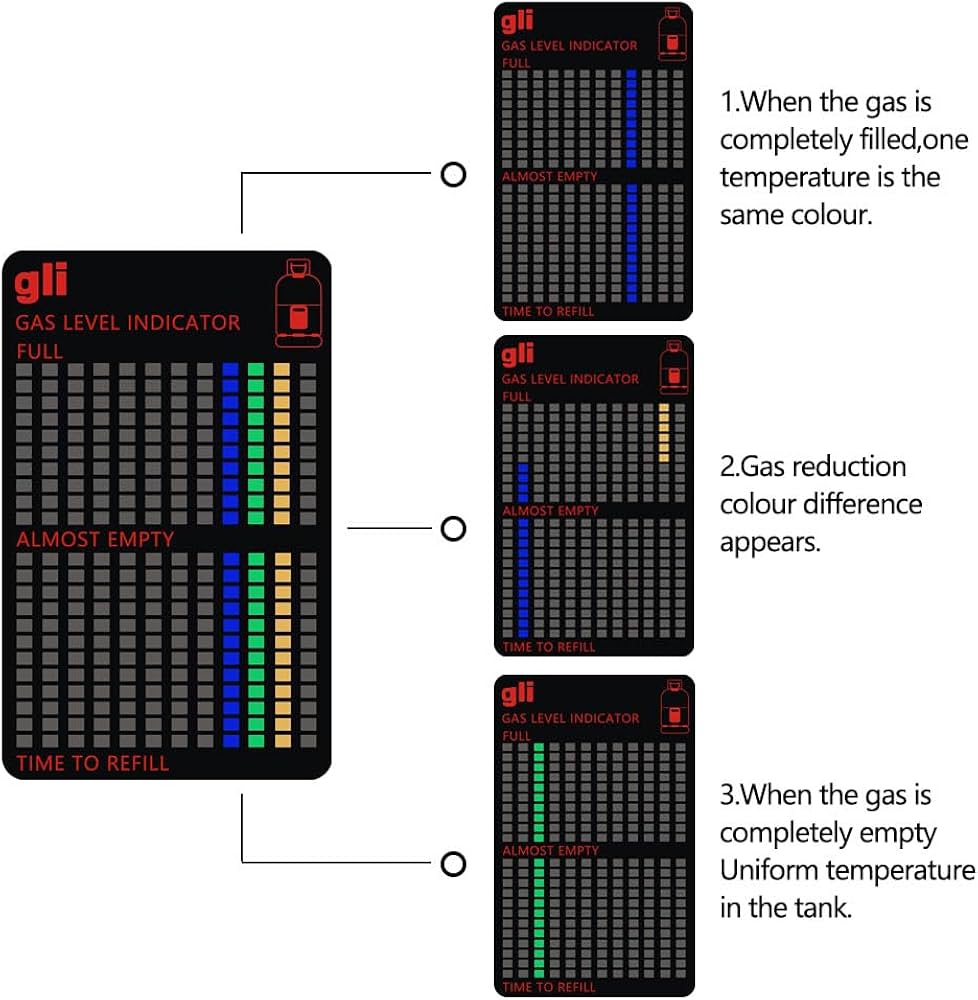 GRILLPRO Indicateur de niveau de gaz propane Master Forge, type 1 80064 Indicateur Magnetique Temperature 1 Pièces Indicateur De Niveau De Gaz, Magnétique Bouteille Gaz Propane Connaître La Quantité Le dos magnétique de la testeur niveau bouteille de gaz est facilement amovible, ce qui vous permet de l'utiliser de manière répétée pendant des années, fournissant ainsi une méthode précise et fiable pour mesurer la quantité de gaz restant dans une bouteille. L'emballage comprend : Vous recevrez 1pcs indicateur niveau gaz bouteille, qui sont 100mm/3., 93inch long et 63mm/2., 48inch large. MATÉRIAU DE HAUTE QUALITÉ : L'testeur niveau bouteille de gaz est fabriqué à partir d'un matériau enduit, magnétique et thermocollant, résistant aux températures élevées, durable, solide, flexible et ne s'abîmant pas facilement. ECENCE 1 pièce Indicateur de Niveau de gaz Bouteille magnétique - Testeur Propane et Butane, jauge pour Caravane, Voyage et Camping · 1x. €6.49€6.49. In stock L'indicateur magnétique de niveau de gaz indique le niveau de gaz en un coup d'œil grâce à une échelle d'affichage précise. Propane Butane GPL Gaz Carburant Gaz Mesureur De Niveau De Réservoir... ÉCHELLE COLORÉE : L'échelle colorée de la magnétique bouteille gaz propane butane indicateur change en fonction du niveau de gaz. Avec le changement de volume de gaz, le testeur niveau bouteille de gaz peut être réutilisé, ce qui économise des coûts et protège l'environnement, et peut répondre à vos différents besoins.