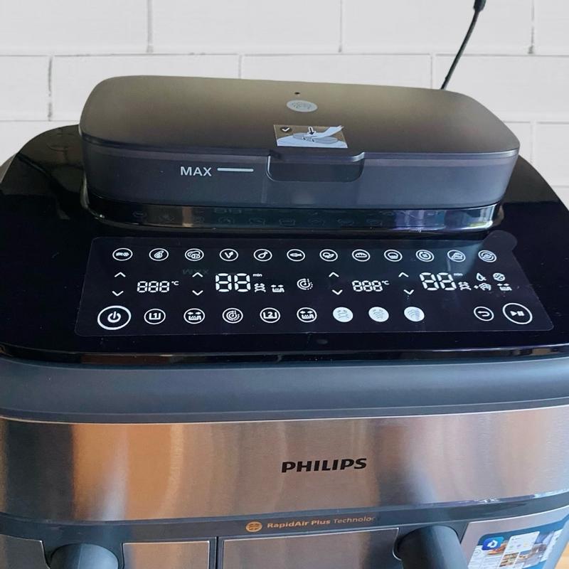 PHILIPS NA555/00 Airfryer avec fonction vapeur Argenté Friteuse à Philips Recettes Pour Serie 5000 Philips Airfryer NA555/00 Série 5000 Double Panier Friteuse Sans Huile Peut contenir 1100 g de frites, 1600 g de légumes ou un poulet de 1,2 kg. Deux paniers, d'innombrables possibilités : Airfryen, cuisson vapeur – ou tout simplement les deux en même temps. Fonction steam : l'alimentation en vapeur dans le grand panier assure une cuisson à la vapeur particulièrement douce des légumes, du poisson ou des pâtes comme les boulettes. Philips Airfryer série 5000 NA555/00 | Livré demain - Krëfel Ainsi, les aliments conservent leur texture et conservent 87 % de nutriments en plus que la cuisson classique². Peut accueillir jusqu'à 1 100 g de frites, 1 600 g de légumes ou 12 pilons de poulet. Un poulet entier de 1,2 kg tient dans le grand panier Steam & Airfry – Le meilleur des deux mondes : la technologie de vapeur assure des résultats délicats, tandis que la technologie RapidAir Plus offre une perfection croustillante. Le premier Airfryer Dual Basket avec fonction de cuisson à la vapeur et la technologie unique RapidAir Plus.