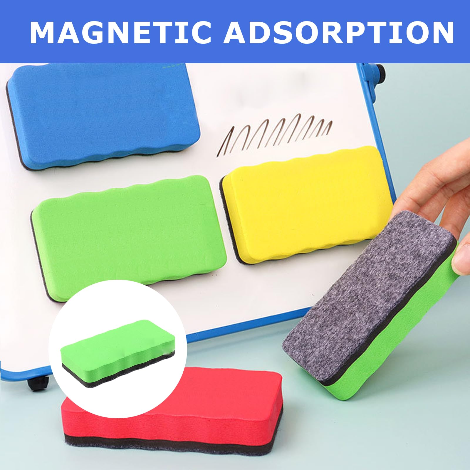 Fini les pertes d'effaceurs. Fini les tableaux blancs sales ! Cet effaceur magnétique bleu (10,7x5,5x2 cm) est fait en mousse EVA et microfibre – super doux et efficace Découvrez le compagnon idéal pour l’école, le bureau et la maison – notre lot de 4 effaceurs tableau blanc magnétiques aux couleurs vives ! Cet accessoire réutilisable est un indispensable pour garder vos surfaces propres. Parfaite pour une utilisation scolaire quotidienne. Chaque utilisateur a sa propre couleur pour une hygiène renforcée en classe ou au bureau. Ultra légère (16g), elle convient aussi bien aux enfants qu'aux adultes. Nettoyage efficace sans traces]Conçu en mousse EVA de qualité et base en microfibre douce, cet effaceur tableau blanc élimine les marques de stylo sans... Grâce à deux aimants puissants intégrés, il adhère fermement à toutes surfaces magnétiques : tableaux blancs, tableaux en verre, flipcharts ou tableaux magnétiques – fini les accessoires perdus ! Effaceur magnétique de tableau blanc d'école de bureau de Foska pour le nettoyage de conseil Brosse Tableau Blanc Microfibre JEFURE Effaceur Tableau Blanc 4 Pièces 4 Couleurs, Brosse Tableau Blanc Bleue Magnétique, Effaceur Ardoise Pour Nettoyage à Sec Nombreuses Surfaces, Eponge Tableau Blanc Pour Tableaux Noirs Et Verre Lot 4 Couleurs Tableau Un vrai outil de nettoyage effaçable à sec sans produits chimiques. Le lot inclut 4 couleurs distinctes (bleu, vert, rouge, jaune), idéales pour organiser l’usage en classe, au bureau ou à la maison. Réutilisable, léger, efficace et polyvalent, cet effaceur est l’accessoire tableau blanc indispensable au quotidien. Ne pas utiliser avec des marqueurs permanents ou à base d’huile. 🧲【Adhérence magnétique fiable】Chaque effaceur tableau blanc magnétique est équipé de deux aimants puissants pour adhérer fermement à toutes surfaces magnétiques comme tableaux blancs, tableaux en verre, ou planning mural.