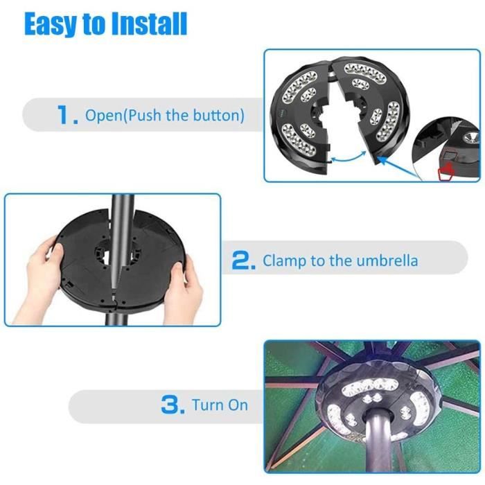 Design attrayant : avec 104 LED sur 8 cordes de fil de cuivre, notre lampe solaire pour parapluie est parfaite pour éclairer des tentes ou des parapluies à 8 baleines. Illuminez votre cour avec notre lampe solaire pour parasol. 8 Modes de Fonctionnement]-- Modes d'éclairage magnifiques, y compris combinaison, vagues, séquentiel, lueur lente, poursuite, fondu lent, scintillement et fixe DÉCORATION PARFAITE : Si vous souhaitez ajouter une touche de lumière et d'ambiance chaleureuse à votre prochaine fête en plein air, ce parasol de jardin solaire est la solution parfaite pour vous. 8 modes d'éclairage intégrés et fonctions de réglage de la luminosité, adaptés à diverses scènes Avec une recherche de centre simple et une fixation de ficelle sécurisée sur le pilier, il est parfait pour une utilisation intérieure et extérieure, étant à la fois étanche et sûr. Lampe pour parasol GENERIQUE 2PCS Lampes solaires flamme lumière Alimentation facile : profitez d'un éclairage extérieur facile et sans effort avec cette lampe parapluie à énergie solaire dotée d'une alimentation basse tension de 5 V pour une alimentation solaire ou par batterie fiable, ce qui en fait le choix parfait pour l'éclairage. Largement applicable : notre lampe solaire pour parasol pour cour, terrasse, patio et jardin est parfaite pour éclairer les zones de piscine, de pelouse et de jardin, ce qui en fait un choix idéal pour tout type de rassemblement ou d'occasion. éclairage Solaire Jardin IP67 étanche 104 LEDs Solaire Lampes Pour Parasol, 8 Modes Lampe Parasol De Patio Avec Telecommande Ip67 Etanche Guirlandes Lumineuses Ideales Pour Jardin Tentes De Camping 88959102 Eclairage Parasol Caractéristiques: 8 bandes de 13 LED, soit un total de 104 LED Paramètres du panneau solaire : environ 6,8x6,8x2,4 cm/2,68x2,68x0,95 pouces, 1,2 V, 100 mA Capacité : 800 Mah Temps de charge : 4 à 6 heures Temps de décharge : 10-14 heures Alimentation : boîtier de batterie 8 fonctions + double alimentation USB ; énergie solaire (piles non incluses) Modes : 8 modes Étanchéité : IP67 Liste de colisage: 1 * lampe de parasol à énergie solaire Remarques : 1., En raison des effets d'éclairage et des angles de photographie, il existe une différence de couleur dans le produit, veuillez comprendre., 2., En raison de la mesure manuelle, il existe une tolérance dans la taille du produit. Égayez votre terrasse avec notre lampe solaire pour parasol ! Avec des options de lumière clignotante, clignotante et constante, cette lampe d'alimentation polyvalente basse tension 5 V est parfaite pour une utilisation intérieure et extérieure.