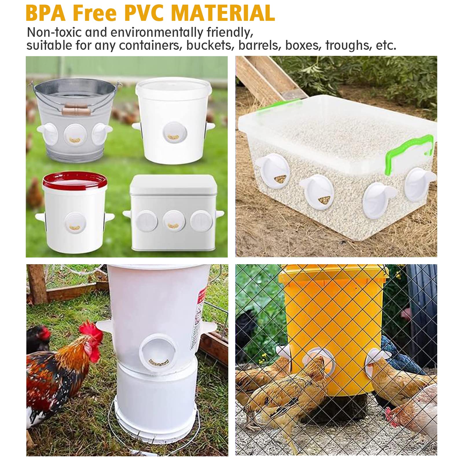 Le kit comprend également 8 couvercles qui ferment les ouvertures du port et empêchent les animaux de pénétrer dans la mangeoire des poules. Placez le récipient de 2 à 3 pouces au-dessus du sol pour que les poules puissent manger confortablement. Moins de gaspillage : le système d’alimentation automatique par gravité du distributeur de nourriture pour poules garantit que les poules ont toujours de la nourriture disponible, sans qu’il n’y ait de déversement ou de désordre Ferme de volaille avec poulet. L'élevage. Entreprise agricole de... Utilisation polyvalente : le distributeur automatique de nourriture pour poulets s'adapte à presque tous les conteneurs tels que les seaux, les barils, les poules ou les bacs. Les distributeurs de nourriture pour chiens ou chats Tirez le meilleur parti des conteneurs existants et créez plus de lieux de nourriture pour vos poules – un moyen économique de nourrir efficacement tous les poulets et de ne pas gaspiller la nourriture. Même une litière pour chat peut servir de récipient. Système Alimentation Poulets Sans Déchets Lot De 2 Distributeurs De Nourriture à Montage Mural Double Mangeoire Poules Anti Nuisible La mangeoire pour poules peut donc être facilement placée dans le parc au lieu de l'écurie. Moins de déchets : le système d'alimentation automatique par gravité du distributeur automatique de nourriture garantit que les poulets ont toujours accès à la nourriture sans renverser de nourriture ou de désordre. Cela aide à économiser les coûts d'alimentation quotidiens.