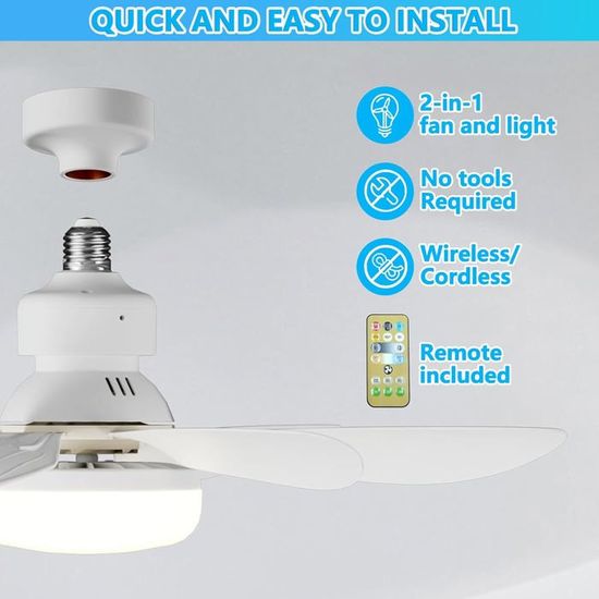 Plano Ahorro Energía Ventilador Con LED y Mando a Distancia Pemba Blanco 132CM e Ventilateur De Plafond Avec Lumière Et Telecommande, 40W Dimmable Ventilateur Plafond Led Avec Douille E27 Lustre Ventilateur De Plafond Pour Chambre Salon 6 Pales3 Vitessestiming Classe Energet 87717849 La vitesse du ventilateur peut atteindre 400r/min, ce qui fournit un flux d'air puissant sans perturber le sommeil, ce qui est particulièrement adapté aux chambres d'enfants, aux chambres à coucher et à d'autres environnements qui nécessitent des niveaux élevés de silence. Ventilateur de plafond réglable E27 pour chambre à coucher avec télécommande Il utilise une source lumineuse LED haute luminosité de 2400 lumens et prend en charge 3 réglages de température de couleur (lumière chaude/lumière naturelle/lumière blanche froide), ce qui permet de créer facilement une atmosphère confortable dans la maison et de répondre aux besoins de différents scénarios. Les ventilateurs de plafond avec douille E27 sont un excellent choix pour raaîchir votre maison tout en illuminant votre espace. Ils sont équipés d'une douille E27 standard, vous donnant la liberté de choisir votre ampoule préférée pour éclairer votre pièce 【Interface sans fil E27】Ventilateur plafond adopte la connexion standard E27, pas besoin de câblage complexe, installation facile et rapide. Ce ventilateur de plafond PRUMYA de 40 W offre 3 vitesses et 3 températures de couleur (chaud, neutre, froid). ... Les vitesses basses sont idéales pour dormir et... 【Silent Copper Brushless Motor】Ventilateur plafond silencieux est équipé d'un moteur DC brushless en cuivre pur, qui fonctionne en douceur et produit un faible niveau sonore, presque silencieux. 【Trois fonctions en une】Ce ventilateur de plafond télécommandé avec lumière combine les fonctions d'éclairage, de ventilation et de décoration.