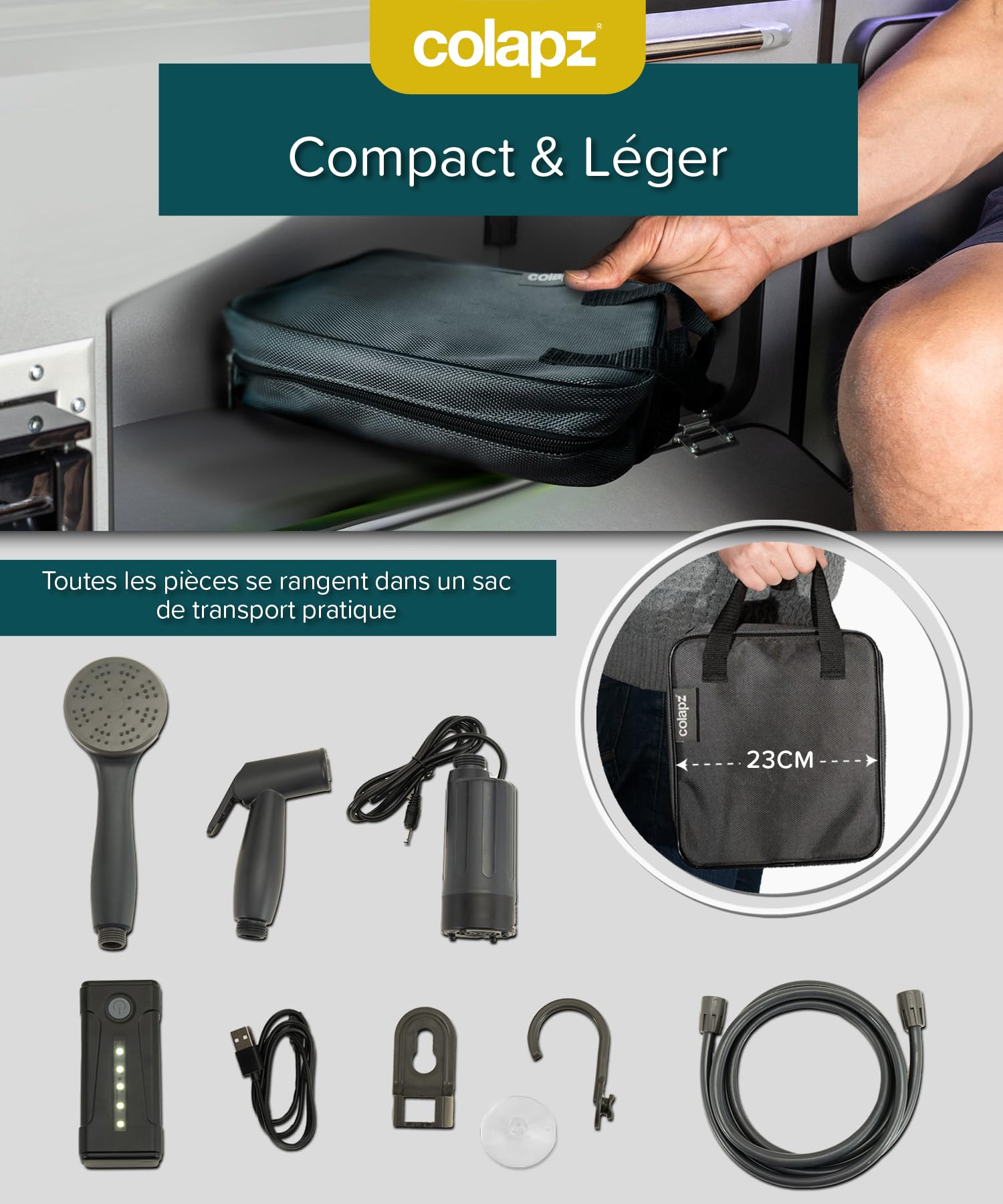 Colapz crée des produits innovants et pratiques pour le camping, les caravanes et les vans afin d’améliorer votre confort en voyage. Privy KAMPA - tente de toilettes & douche nomade pour camping & van aménagé - H2R Equipements Achetez Colapz Douche de Camping Rechargeable - Douche Portable Nomade pour Van, Tente de Douche, Voiture, Vélos et Chiens - 3 Pommeaux de Douche - 1 Étui de Transport Inclus - Indispensable pour Camping-Car POMMEAU DE DOUCHE & JET HAUTE PRESSION – Inclus : un pommeau de douche classique et un pistolet à jet puissant. Idéal après une baignade, une randonnée ou pour se laver avant/après le repas en camping. Découvrez notre avis sur la douche extérieure WJPueluo 20L : idéale... DÉCOUVREZ LA GAMME COLAPZ – Cette douche électrique de camping est parfaite avec notre tente de douche pliable. PROFITEZ D’UNE DOUCHE CHAUDE PARTOUT – Cette douche portable chauffante (220V, 2000W) vous permet de profiter d’une douche agréable où que vous soyez. Camping Accessoires Douche De Camping Rechargeable - Douche Portable Pour Chiens - Jet Wash Pommeau De Douche