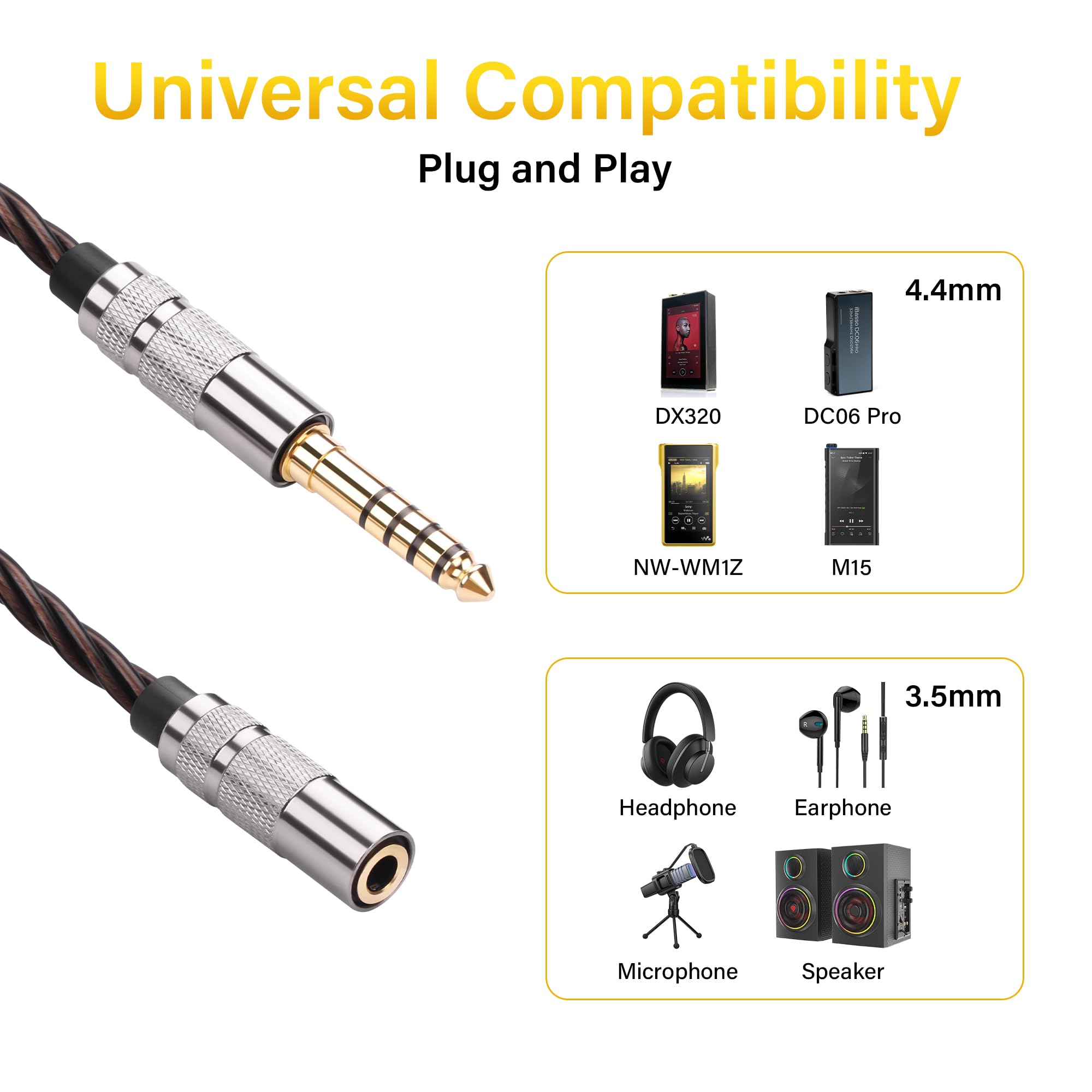Améliore la conductivité, optimise la séparation des canaux et restitue des basses précises et nettes Esthétique métallique classique au luxe discret. Équilibré avec prise en charge du microphone : grâce à la conception unique de coupleur équilibré de 4,4 mm vers prise TRRS de 3,5 mm, ce câble transmet non seulement des signaux audio, mais prend également en charge complètement le canal du microphone Design universel orienté vers la portabilité : la longueur standard de 15 cm est optimisée pour une utilisation pratique, adaptée pour les systèmes Hi-Fi de bureau ou pour connecter des appareils audio portables, et aide les utilisateurs à maintenir un câblage bien rangé entre les appareils Noyau en cuivre sans oxygène OFC : le câblage haute purity ofc réduit la résistance, améliore la conductivité et améliore la résolution audio, la séparation et la réponse des basses Câble Jack 2M,Jack Plug 3,5 Mm,Fiche Stereojack Mâle Vers Femelle,Câble Structure renforcée à quatre cœurs : le câble tressé à quatre brins avec gaine extérieure durable augmente la résistance à la traction Réduction des interférences du bruit : le blindage de précision minimise l'effet de la peau et la distorsion des radiofréquences, offrant un son propre et transparent. Accessoire Audiophile Haute Fidélité Câble Audio - Adaptateur - 23 Cm - Fiche Mâle - Connecteur Femelle Jack - Noir - Informatique Câble Court 15cm Audiophile Âme OFC (Cuivre Sans Oxygène) Conçu pour les audiophiles en quête de reproduction sonore fidèle, ce câble adaptateur audio 4,4 mm vers 3,5 mm intègre un connecteur balanced plaqué or et une âme en cuivre sans oxygène (OFC) pour minimiser la perte de signal à la source. Élimine les interférences électromagnétiques et l'effet de peau pour une extension des aigus plus naturelle.