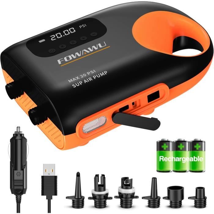 La pompe gonflable intègre un capteur de pression d'air en temps réel de haute précision, supporte une batterie rechargeable de haute capacité de 13500mAH, supporte également la charge de voiture 12V, avec 6 buses gonflables, un éclairage LED et une fonction d'alimentation mobile, elle peut être utilisée comme une banque d'énergie et une lumière d'urgence. FBSPORT Gonfleur Electrique Paddle 20PSI, 12V DC Pompe Paddle Electrique avec Fonction d'arrêt Automatique et Affichage LCD, Gonflage et Dégonflage 2 en 1 pour SUP, Bateaux Gonflables, Kayaks, Matelas Vous pouvez nous contacter à tout moment si vous avez des questions ! Il est doté d'une double fonction de protection pour une utilisation plus sûre. Si vous avez des questions, n'hésitez pas à nous contacter ! Gonfleur Paddle Electrique Gonfleur Electrique Paddle/Kayak STAR PUMP 8 - 20 PSI , Pompe De Gonflage électr Pompe Tente Bateau 【Puissance élevée】 : la gonfleur electrique paddle fournit une pression élevée de 20 PSI et un débit d'air de 80 L/min, ce qui augmente la vitesse de gonflage de 60 % par rapport à une pompe à air classique. 【Type-C&12V】 : la pompe à air électrique prend en charge le chargement bidirectionnel et dispose d'une batterie haute capacité intégrée de 13500 mAh. Elle est dotée d'une poignée pour un transport facile. 【Compatibilité parfaite】 : Pompe electrique paddle est équipé de 6 buses de gonflage, adaptées aux kayaks, tentes gonflables, planches de paddle, canapés gonflables, matelas, piscines gonflables, bouées, etc. Gonfleur électrique Paddle : les eilleurs odèles en 2020 Il vous suffit de choisir la buse appropriée pour la connecter facilement et répondre parfaitement à tous vos besoins de gonflage. Meilleure pompe électrique pour paddle en 2024 | Avis & Comparatif...